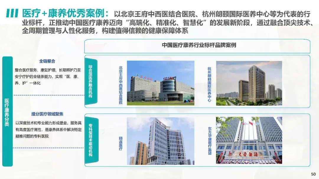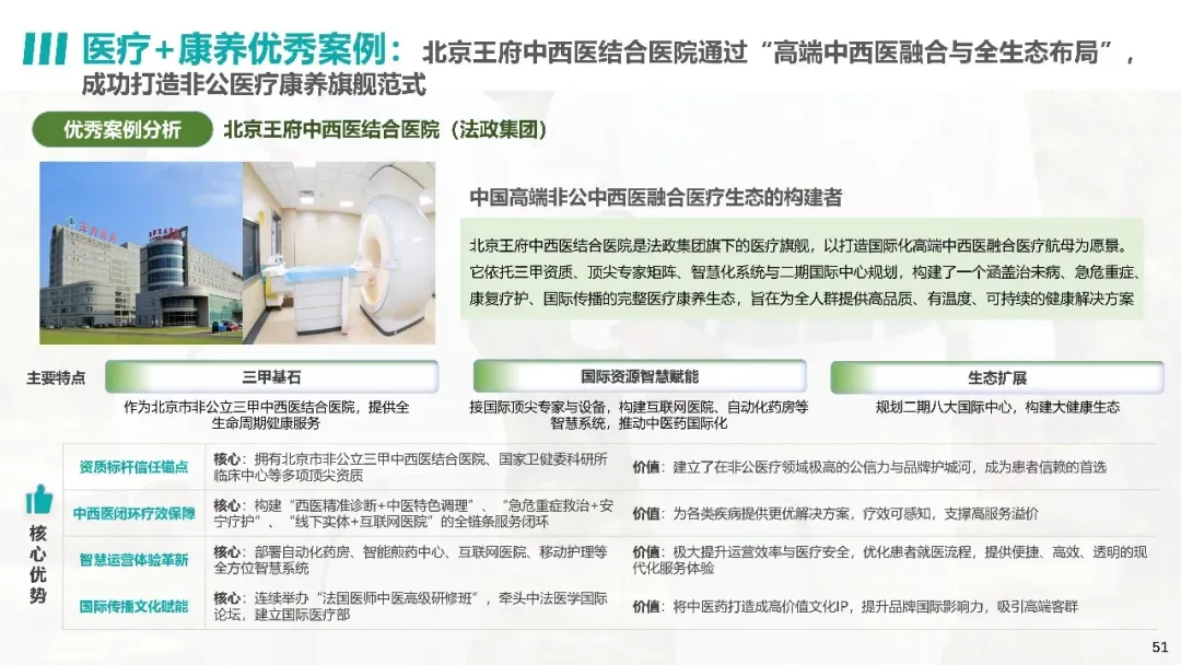 2.医疗+康养赛道向“高端化、精准化、智慧化”转型,北京王府中西医结合医院作为非公三甲中西医结合医院,构建了“西医精准诊断+中医特色调理”的全链条服务闭环。通过部署自动化药房、互联网医院等智慧系统,整合国际顶尖专家与设备,提供从治未病到安宁疗护的全生命周期服务,同时通过国际医疗部推动中医药国际化传播。