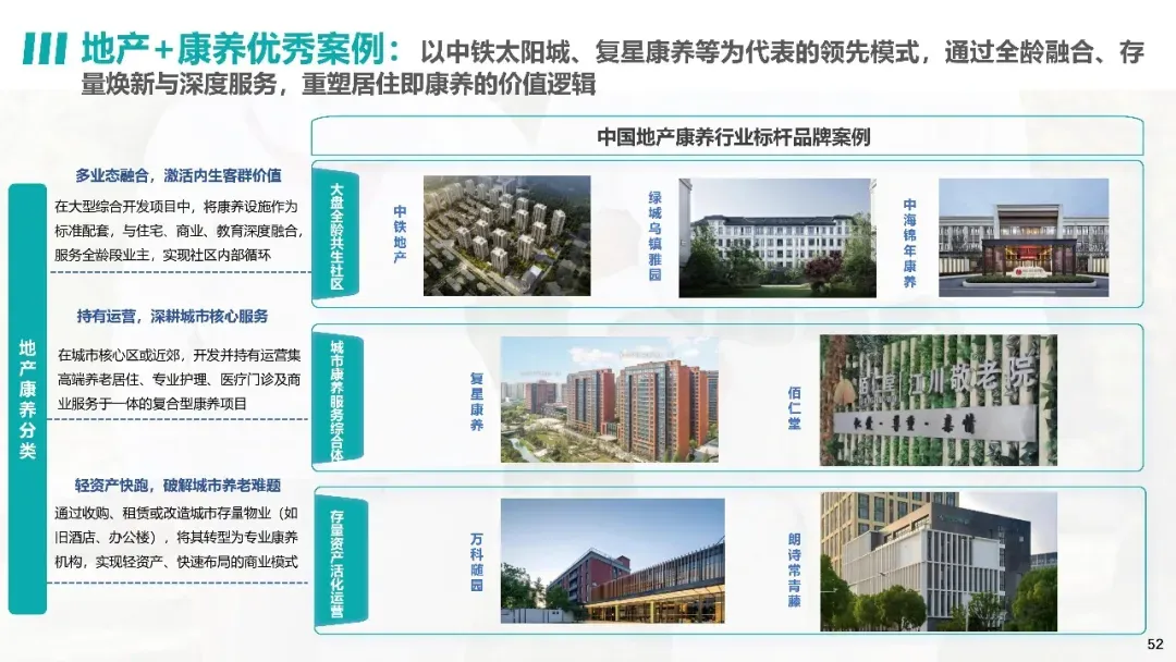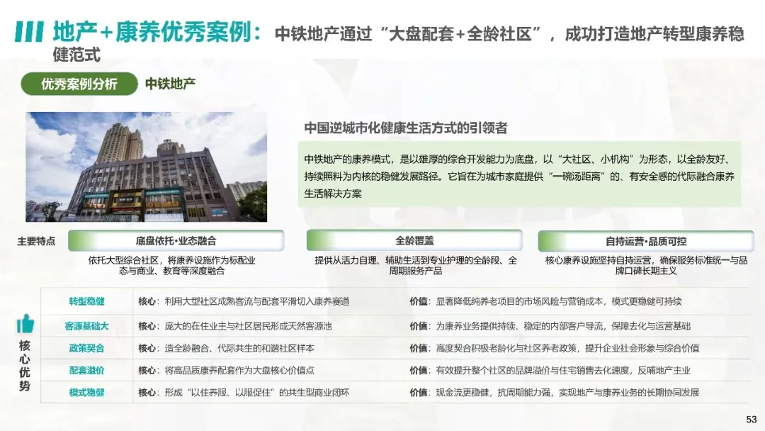 3.地产+康养赛道重塑“居住即康养”的价值逻辑,中铁地产以“大盘配套+全龄社区”为模式,将康养设施作为大型社区标配,与商业、教育深度融合。提供从活力自理到专业护理的全周期服务,核心康养设施坚持自持运营,形成“以住养服、以服促住”的共生闭环,既降低了纯养老项目的市场风险,又提升了社区品牌溢价。