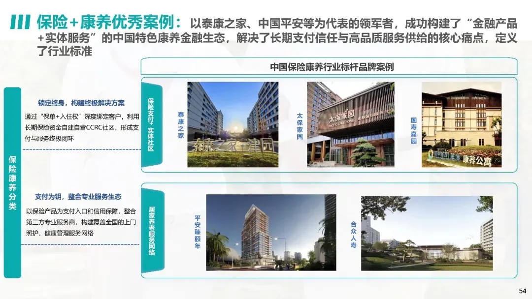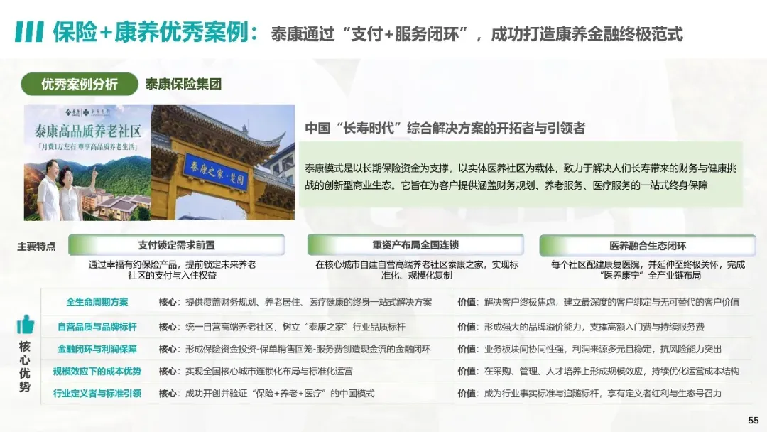 4.保险+康养赛道以泰康之家为代表,构建“金融产品+实体服务”的生态体系。通过“幸福有约”保险产品锁定客户未来入住权益,在核心城市自建自营高端养老社区,每个社区配建康复医院,完成“医养康宁”全产业链布局。这种“支付+服务”的闭环模式,解决了长期支付信任与高品质服务供给的核心痛点,成为行业标杆。