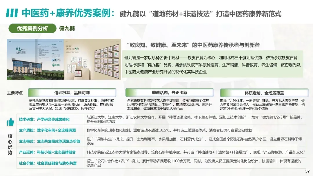 5.中医药+康养赛道推动国粹焕新,健九鹤以“道地药材+非遗技法”为核心,依托余姚铁皮石斛国家地理标志,建立从种植到销售的全产业链品控体系。其传承16道非遗炮制工序,结合现代科技开发九大系列产品,通过“公司+合作社+农户”模式带动农民增收,实现“产业即旅游、产品即文化”的发展格局。