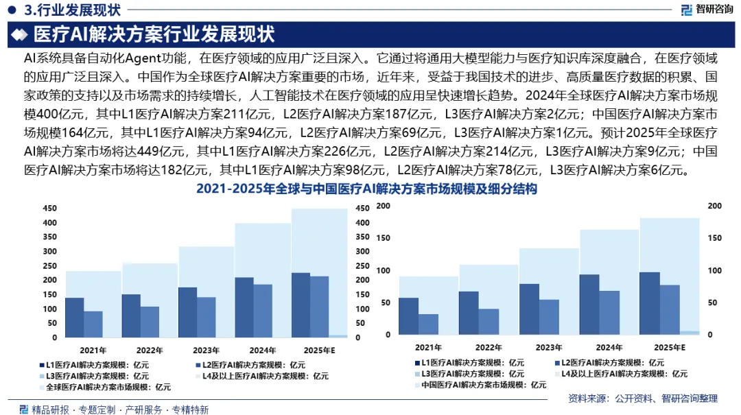 中国市场规模:2024年,中国医疗AI解决方案市场规模164亿元,其中,L1医疗AI解决方案规模94亿元,L2医疗AI解决方案规模69亿元,L3医疗AI解决方案规模为1亿元;预计2025年中国医疗AI解决方案市场规模达到182亿元,其中,L1医疗AI解决方案规模98亿元,L2医疗AI解决方案规模78亿元,L3医疗AI解决方案规模6亿元。