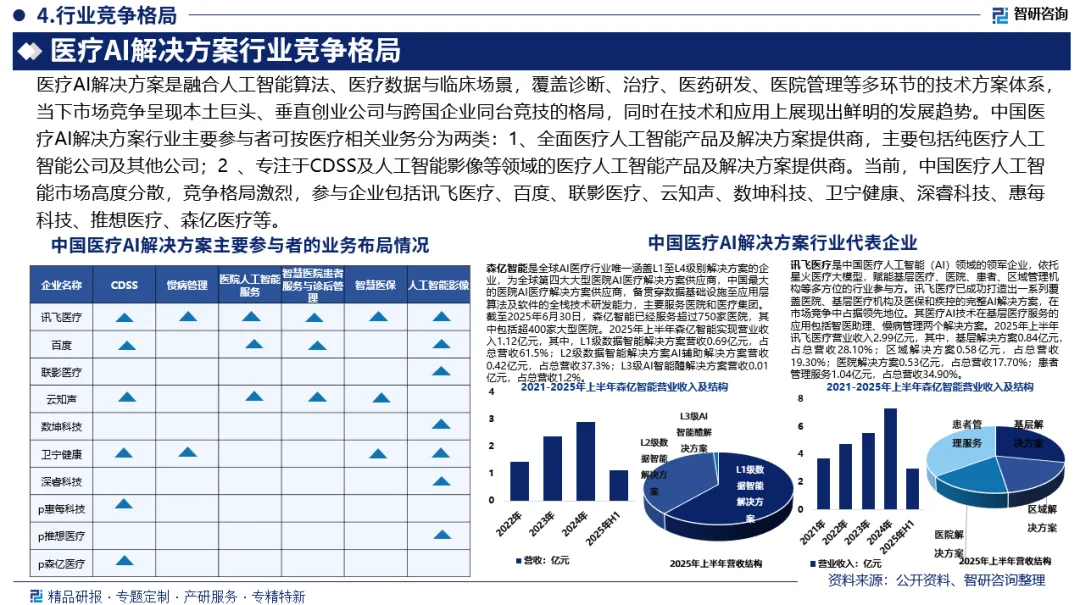 竞争情况:当下医疗AI解决方案竞争呈现本土巨头、垂直创业与跨国企业公司同台竞技的格局,同时在技术和应用上展现出鲜明的发展趋势。中国医疗AI解决方案行业参与者按医疗相关业务分为全面医疗人工智能产品及解决方案及专注于CDSS及人工智能影像等领域的医疗人工智能产品解决方案提供商。当前,中国医疗人工智能市场高度分散,竞争格局激烈,企业有讯飞医疗、百度、联影医疗、云知声、数坤科技、卫宁健康、深睿科技、惠每科技、推想医疗、森亿医疗等。
