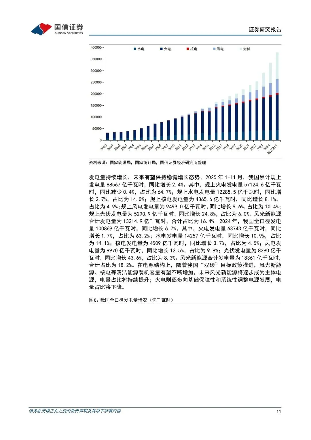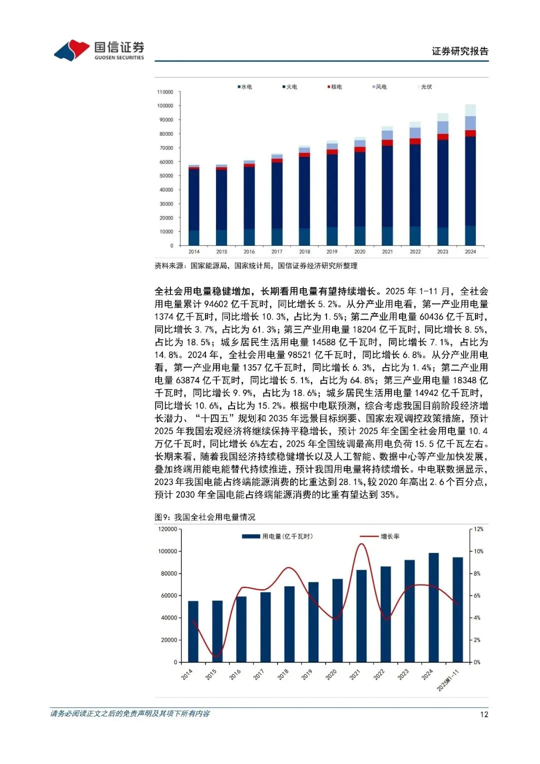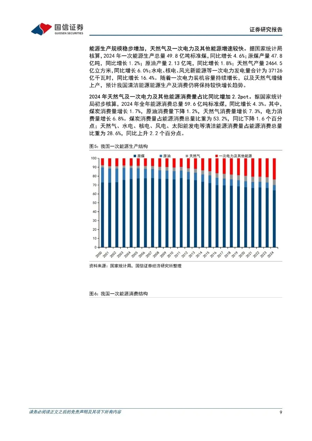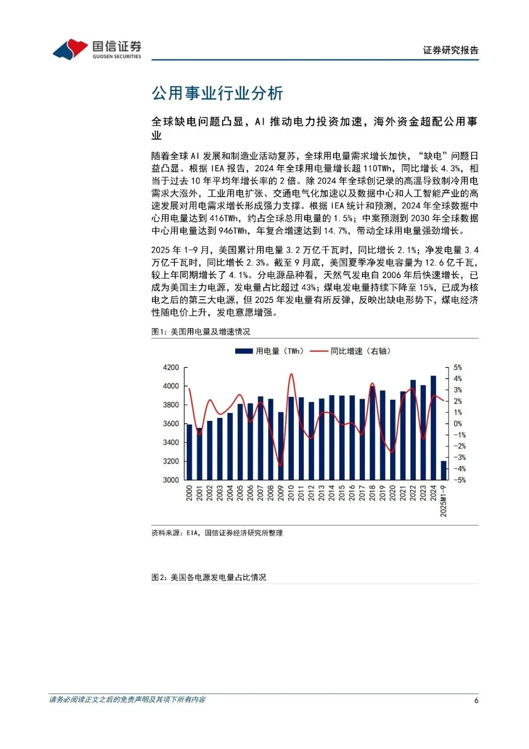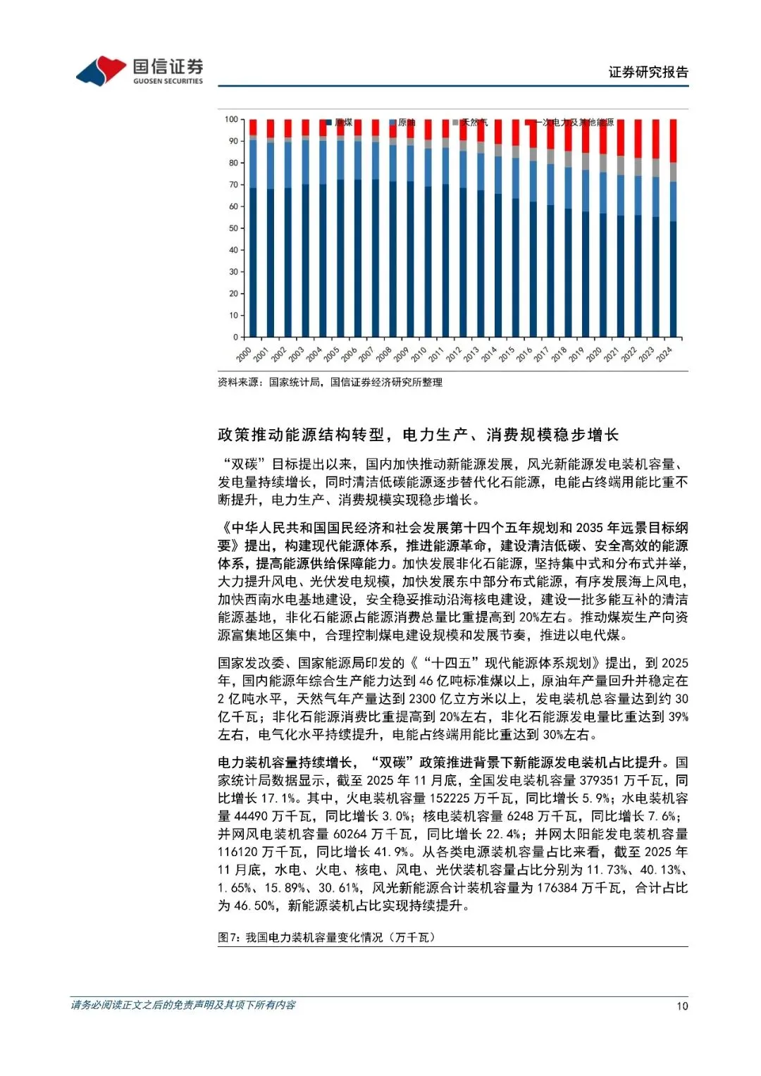 公用事业行业包括电力、燃气、水务等细分行业,具有突出的“刚需”属性,长期经营发展较为稳健。“双碳”目标政策提出以来,国内能源结构低碳化转型,天然气、一次电力及其他能源生产、消费规模呈增长趋势,逐步替代化石能源,2024 年天然气、水电、核电、风电、太阳能发电等清洁能源消费量占能源消费总量比重为 28.6%,同比上升 2.2 个百分点。长期来看,清洁低碳能源逐步替代化石能源,电能占终端用能比重不断提升,电力生产、消费规模有望实现稳步增长。