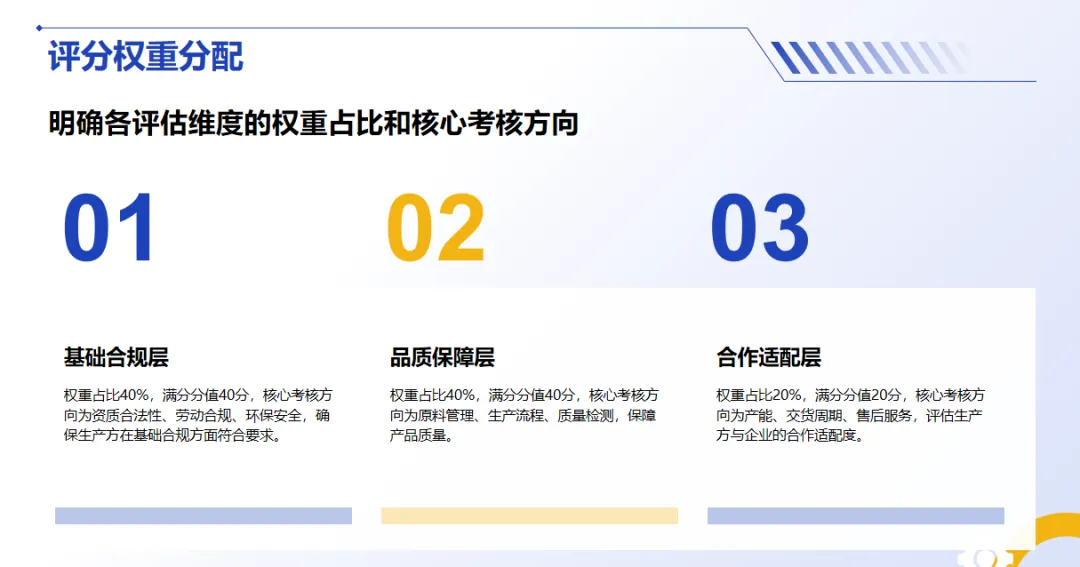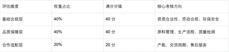 • 基础合规层(【XX】分)+ 品质保障层(【XX】分)+ 合作适配层(【XX】分)= 总分【XX】分
