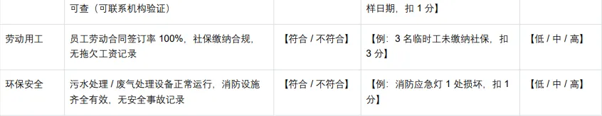 本次验厂的生产方【核心优势,例:产能充足、设备先进】,但存在【核心问题,例:原料管理不规范、检测流程缺失】等中低风险问题,无高风险合规隐患,整体符合 “条件合作” 基础要求。