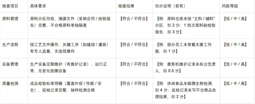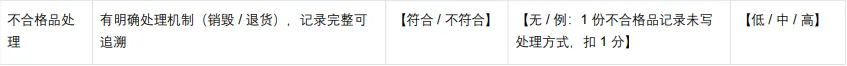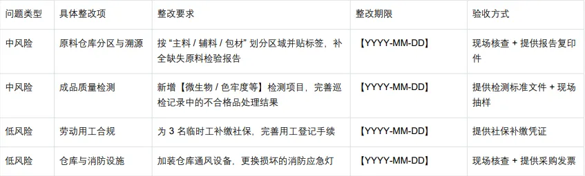 • 中风险问题:【列出具体问题,例:原料分区不规范、成品缺关键检测项】