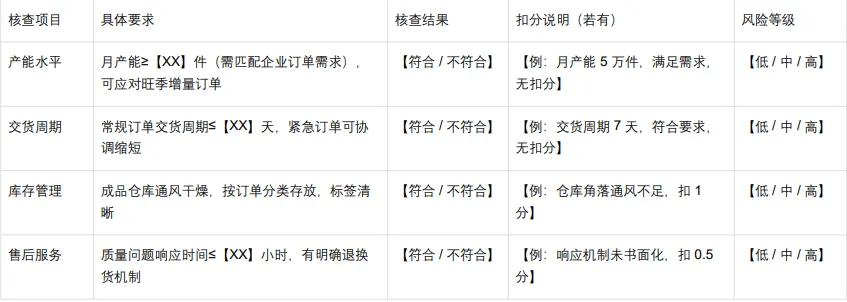 3. 合作决策:复评通过→签订合作协议,首批订单抽检比例提升至【XX】%;复评未通过→终止合作,启动备选生产方筛选;