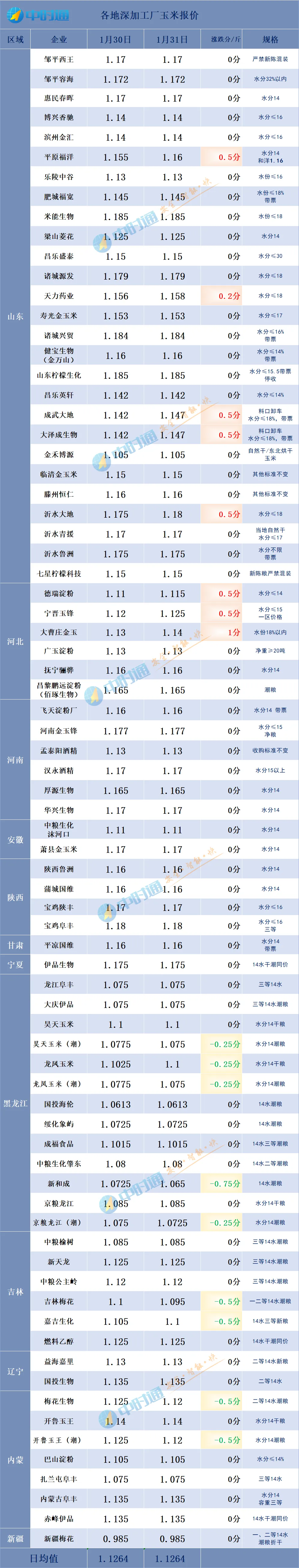 东北收购均价最高值为12月31日的2135.8元/吨(1.0679元/斤),最低值为11月6日的2031.8元/吨(1.0159元/斤)。