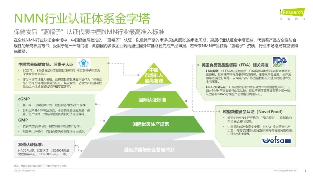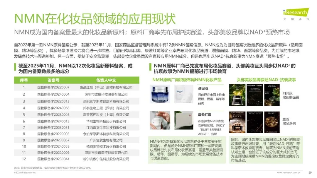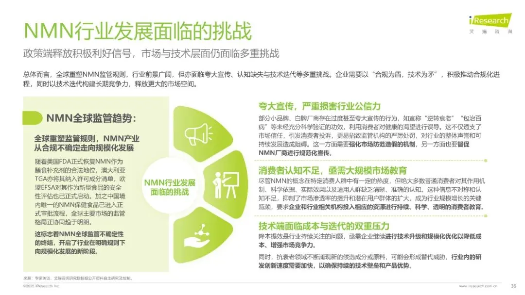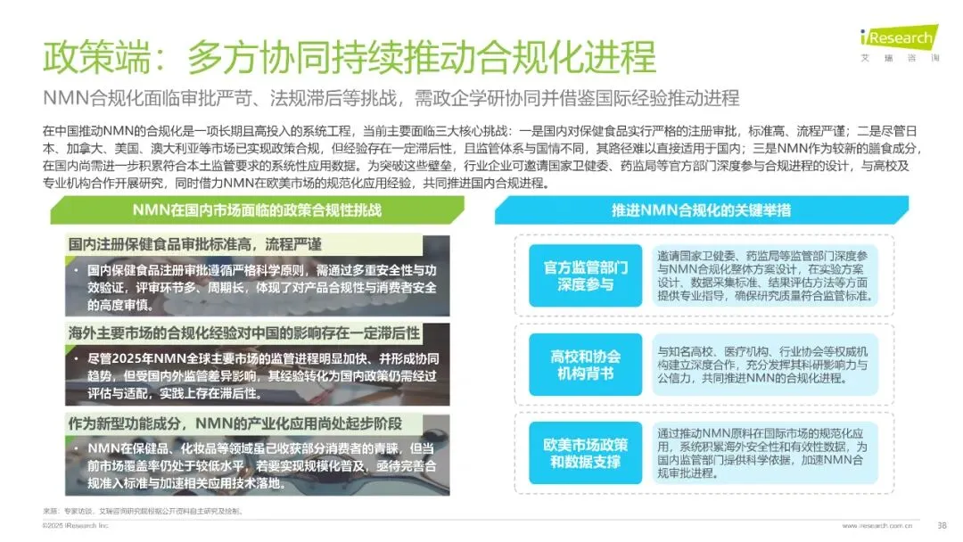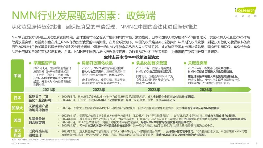全球NMN合规化进程加速,美国、澳大利亚等国已确认其合法地位,中国市场虽政策限制,但2022年作为化妆品新原料备案通过,2025年进入保健食品审批受理名单,未来政策开放可期。