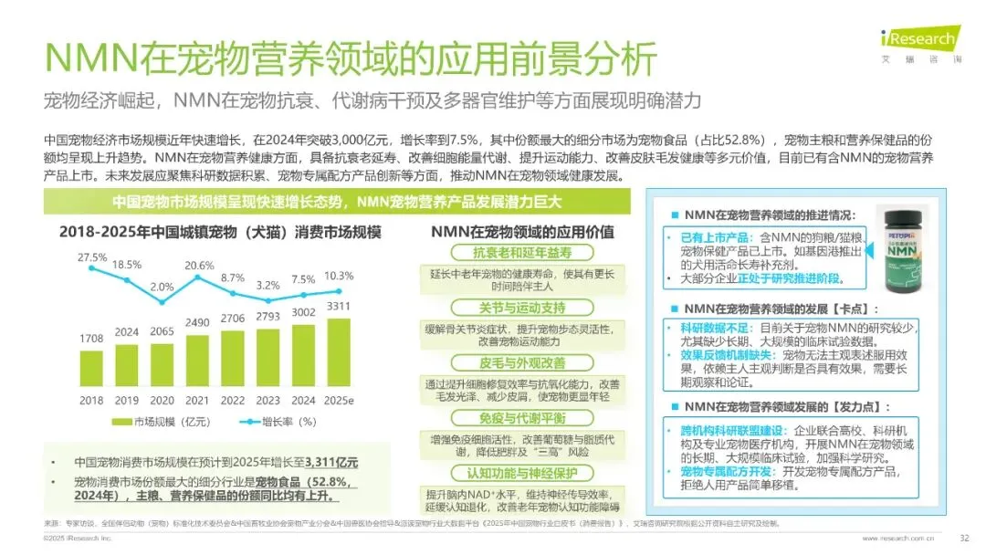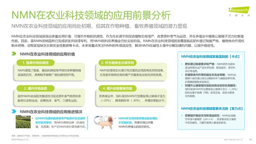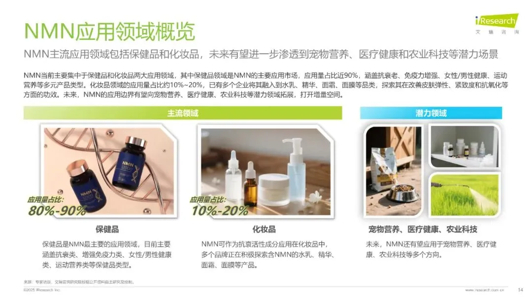 报告分析了NMN的定义、功能、合成工艺、发展历程、市场现状及未来趋势,指出未来NMN有望从保健品、化妆品向医疗健康、宠物营养、农业科技等领域渗透,为人类健康带来新可能。