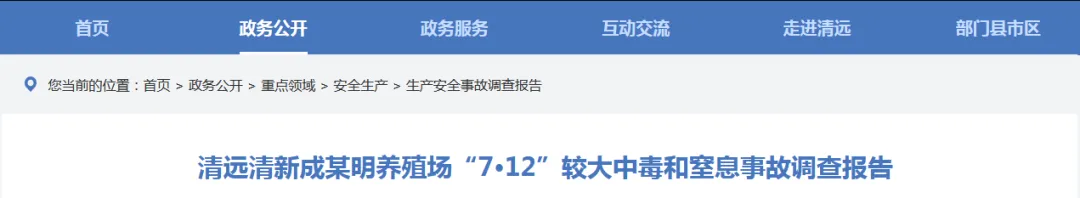 2025年7月12日,广东省清远市清新区石潭镇东安村委会成某明养殖场发生一起较大中毒和窒息事故,造成3人死亡,直接经济损失450万元。