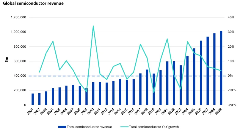 半导体行业的周期性源于“特定应用驱动的短期繁荣后需求回落”。过去25年,全球半导体收入仅两次出现连续三年以上同比增长——2000年代初的企业扩张期与2020年前后的疫情红利期。而2025年起,AI技术推动的收入增长已持续两年,报告预测这一轮增长将延续至2030年,形成六年连续增长,彻底打破历史周期律。