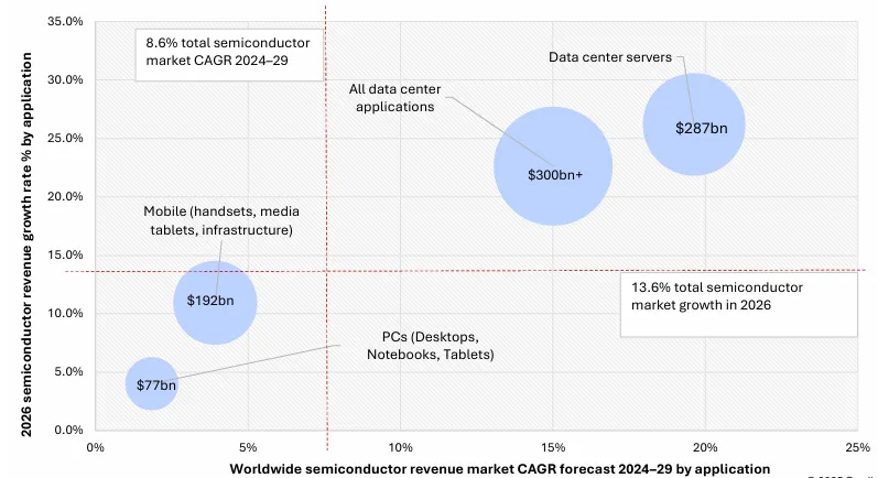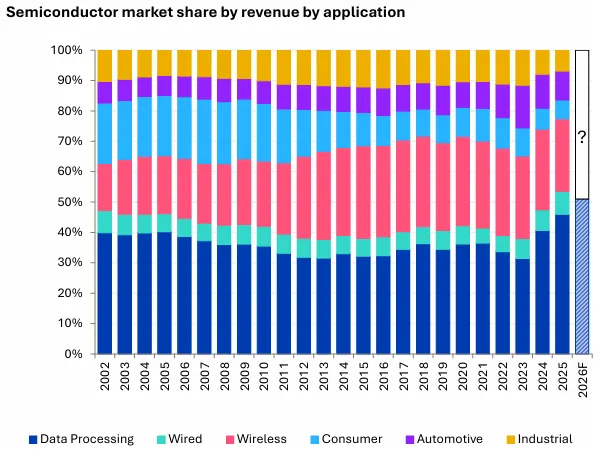 半导体应用可分为六大类(数据处理、有线通信、无线通信、消费电子、汽车、工业),其中数据处理长期是最大单一类别,但市场份额始终未突破40%。2025年,受AI数据中心需求拉动,该板块收入占比跃升至46%(较2023年增长一倍);报告预测,2026年将首次超过50%,成为半导体市场的绝对主导。