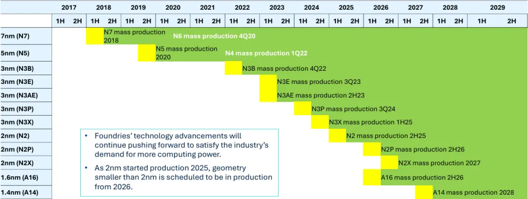HPC是代工厂收入增长的核心动力。2026年,7nm至2nm制程将贡献纯代工厂59%的收入,但仅占硅片出货量的10%。这意味着先进制程的“单位面积产值”远超成熟节点,推动代工厂将资本开支集中于产能扩张与技术研发(如台积电N2、三星SF2等)。