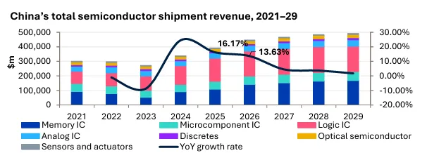 2025年中国半导体市场预计达3930亿美元(同比增16%),2026年增速虽放缓至13.6%,但仍保持双位数。增长动力从消费电子补贴转向AI投资与边缘计算普及——政府补贴推动的消费电子需求放缓后,AI数据中心与边缘设备的芯片需求成为新引擎。