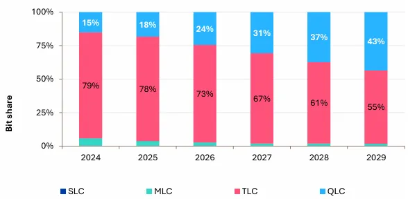 NAND价格在2023年触底后,2024年开启最强复苏(主因供应商控产、库存正常化与云服务商需求)。报告预测,2026年NAND均价将较2023年上涨40%。技术层面,行业向200层以上3D NAND与QLC(四层单元)迁移,但因工艺复杂、客户认证周期长,供应增速慢于需求。QLC企业级SSD(ESSD)将在2026年迎来拐点——AI推理应用创造刚需,尽管成本仍远高于HDD(2029年差距或达6倍),但无法被HDD大规模替代(HDD仍占数据中心80%容量)。