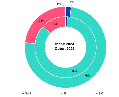 硅基器件仍占主流,但宽禁带半导体(SiC、GaN)增速强劲,2026年收入占比将超20%。SiC在动力总成中持续增长(尽管增速放缓),GaN受益于数据中心需求(如快充、电源模块)。