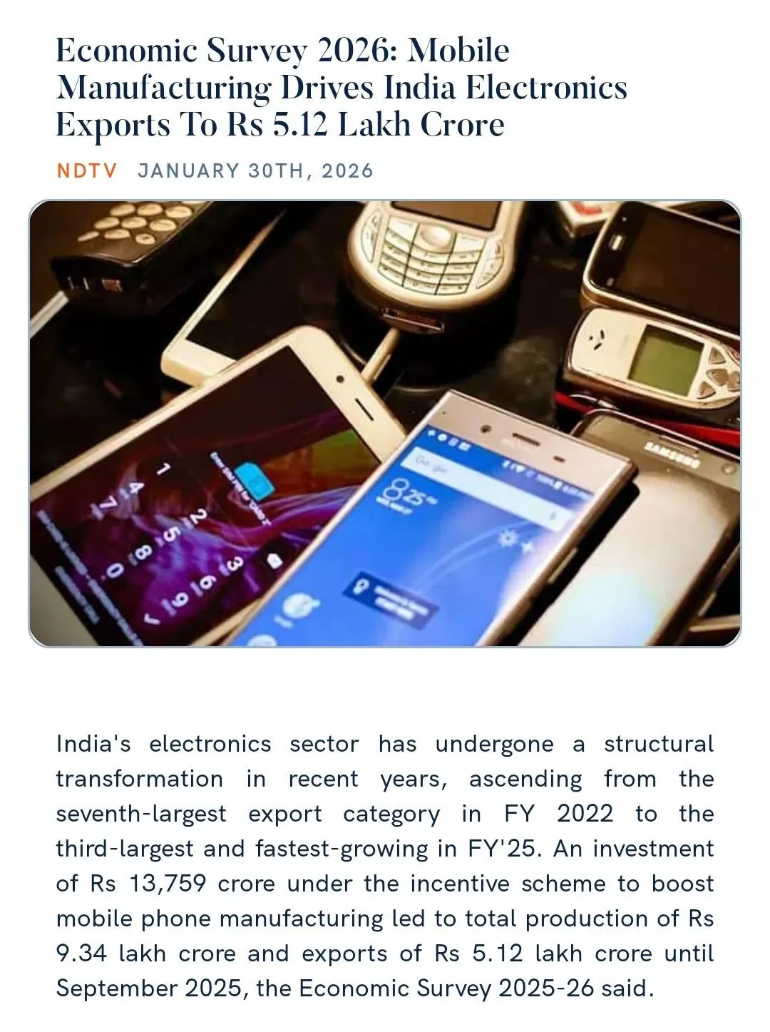 India's electronics sector has undergone a structural transformation in recent years, ascending from the seventh-largest export category in FY 2022 to the third-largest and fastest-growing in FY'25. An investment of Rs 13,759 crore under the incentive scheme to boost mobile phone manufacturing led to total production of Rs 9.34 lakh crore and exports of Rs 5.12 lakh crore until September 2025,the Economic Survey 2025-26 said.