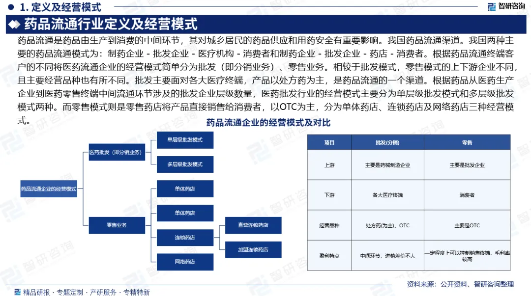 行业定义及模式:药品流通是药品由生产到消费的中间环节,其对城乡居民的药品供应和用药安全有重要影响。我国药品流通渠道。我国两种主要的药品流通模式为:制药企业-批发企业-医疗机构-消费者和制药企业-批发企业-药店-消费者。