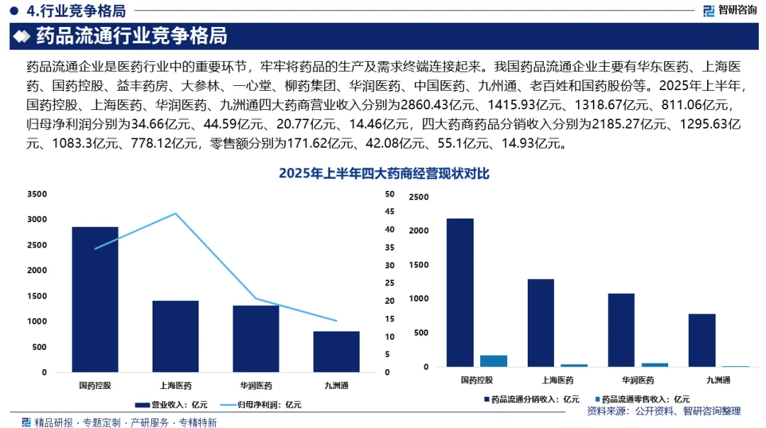 竞争情况:2025年上半年,国药控股、上海医药、华润医药、九洲通四大药商营业收入分别为2860.43亿元、1415.93亿元、1318.67亿元、811.06亿元,归母净利润分别为34.66亿元、44.59亿元、20.77亿元、14.46亿元,四大药商药品分销收入分别为2185.27亿元、1295.63亿元、1083.3亿元、778.12亿元,零售额分别为171.62亿元、42.08亿元、55.1亿元、14.93亿元。