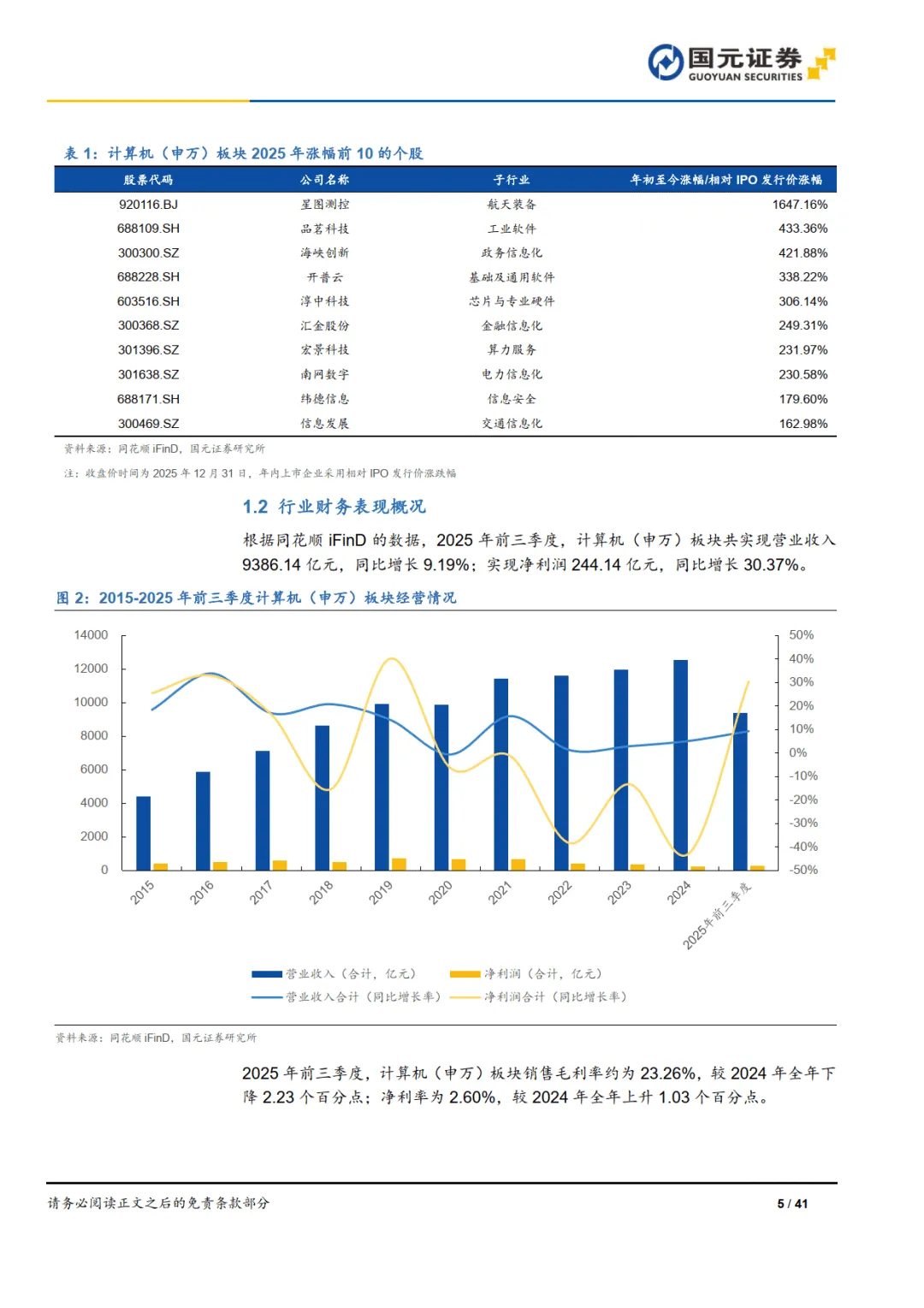 2025 年,计算机行业创新加速,市场表现位居申万行业第 14 位,申万计算机指数上涨 18.24%,跑赢沪深 300,却跑输创业板指、科创 50 等指数。财务方面,2025 年前三季度板块营收 9386.14 亿元,同比增长 9.19%,净利润 244.14 亿元,同比增长 30.37%,估值处于合理区间,具备长期投资价值。————