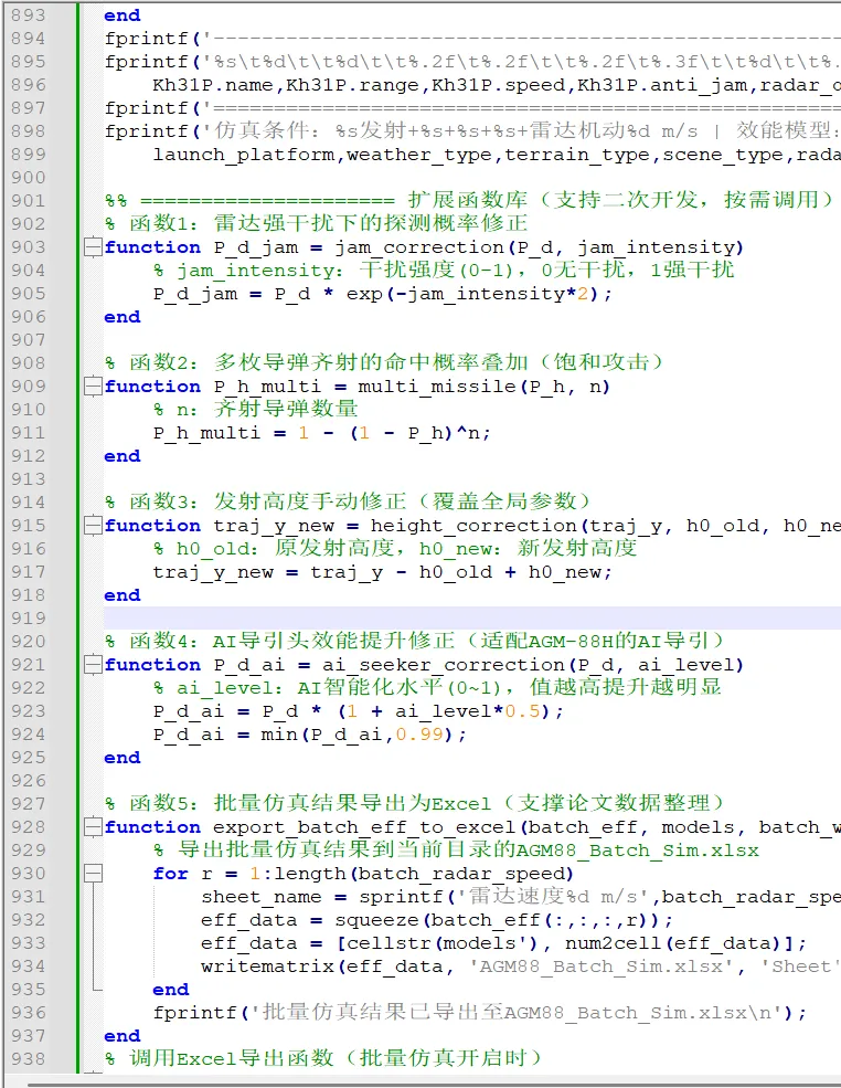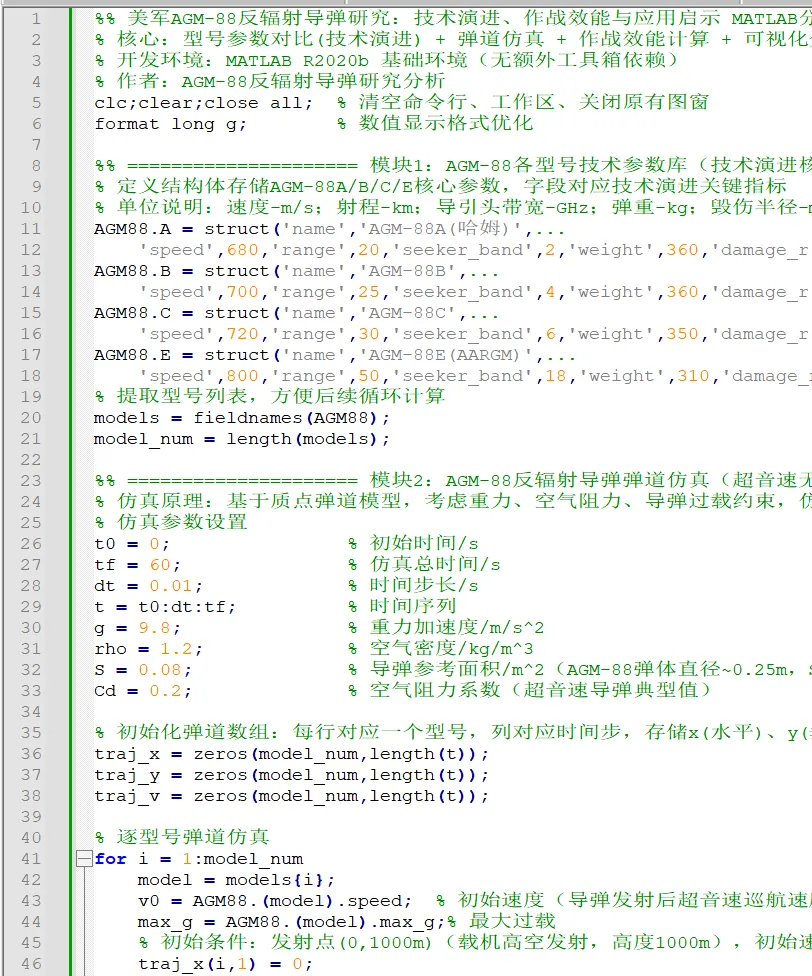 前置条件:无需额外工具箱,基于 MATLAB 基础环境(R2018b 及以上均可运行); 核心模块: 模块 1:AGM-88 各型号技术参数库(体现技术演进); 模块 2:反辐射导弹弹道仿真(超音速弹道、过载约束); 模块 3:作战效能综合计算(探测 - 命中 - 毁伤全链路); 模块 4:结果可视化(参数对比、效能曲线、弹道仿真图); 数据来源:基于美军公开战术手册、国防工业报告的 AGM-88 系列典型参数(非涉密,为行业通用分析值)。