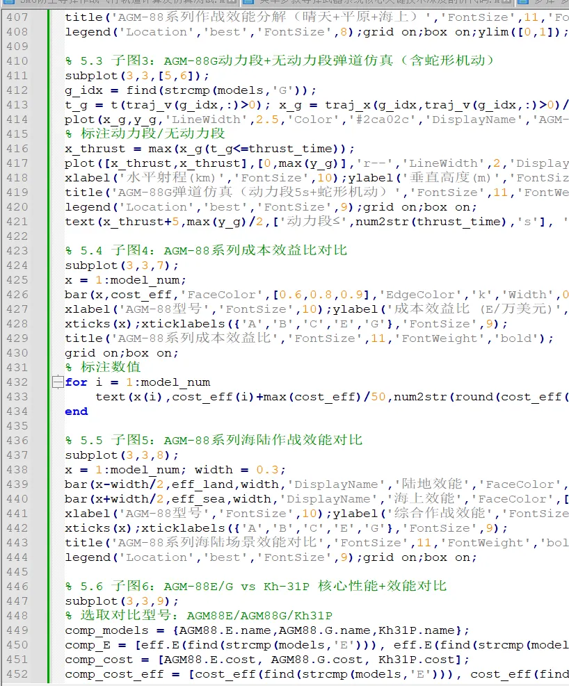 AGM-88 技术演进、作战效能、应用启示的 MATLAB 分析代码,核心将覆盖导弹弹道仿真、反辐射作战效能计算、不同型号技术参数对比三大核心模块(对应技术演进 / 作战效能),并通过结果可视化给出应用启示相关的分析支撑。