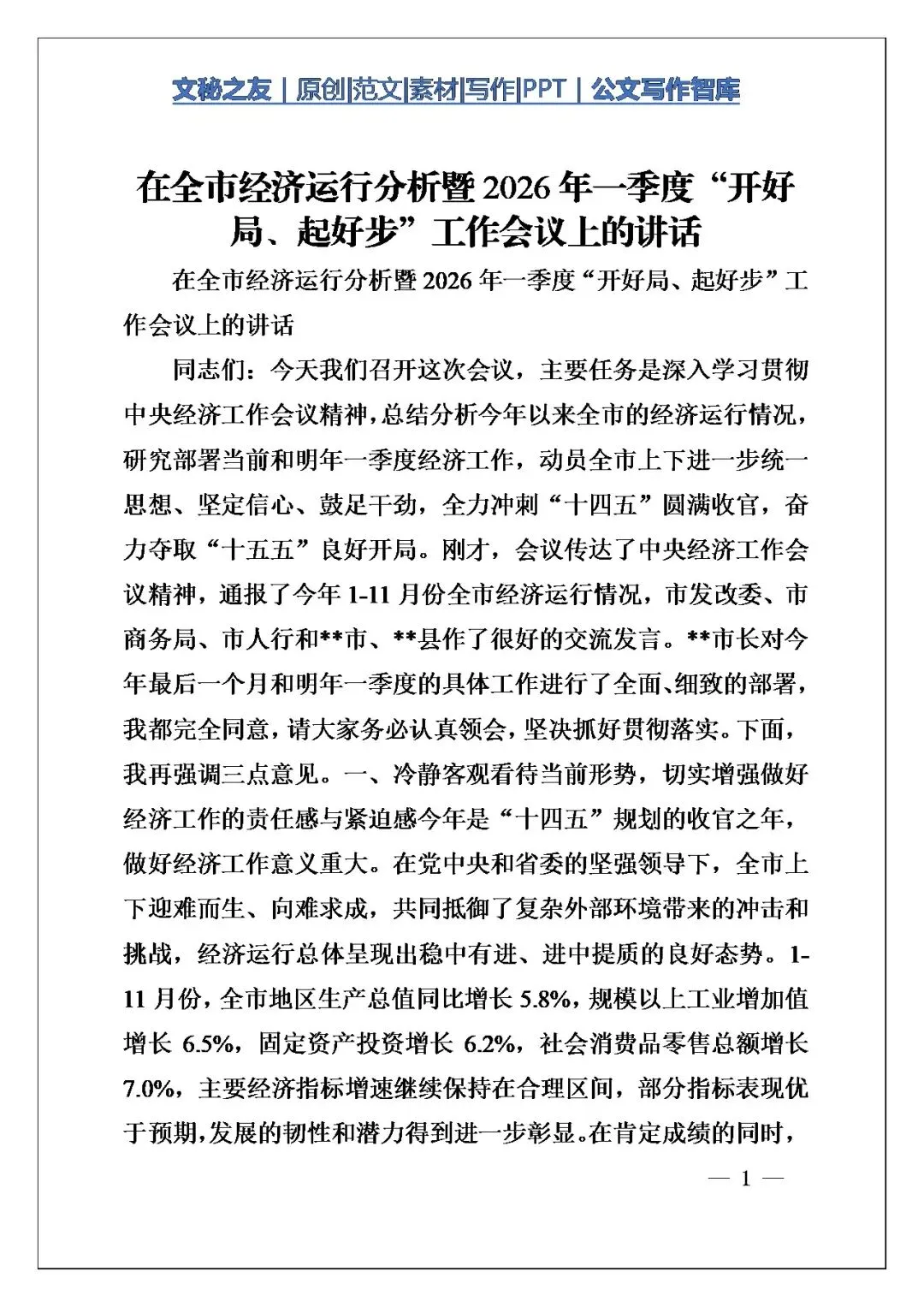 全市经济运行分析暨2026年一季度“开好局、起好步”工作会议讲话