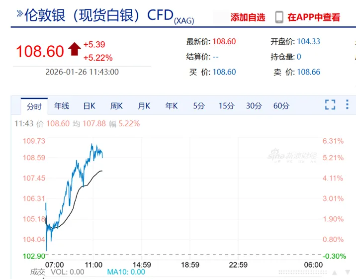 涨势在1月26日后延续,并于1月27日上午一度触及109.24美元/盎司的周内高点,市场情绪达到高潮。