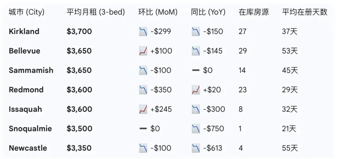 Kirkland以 $3,700 的平均租金成为本月的“身价冠军”。虽然环比有所回落,但其库存(27套)相对充裕。Bellevue的租金本月逆势小幅反弹 $100,显示出极强的抗压能力。值得注意的是,Bellevue的平均在库天数高达53天,说明房东们在租金上虽有坚持,但租客的决策周期正在变长。