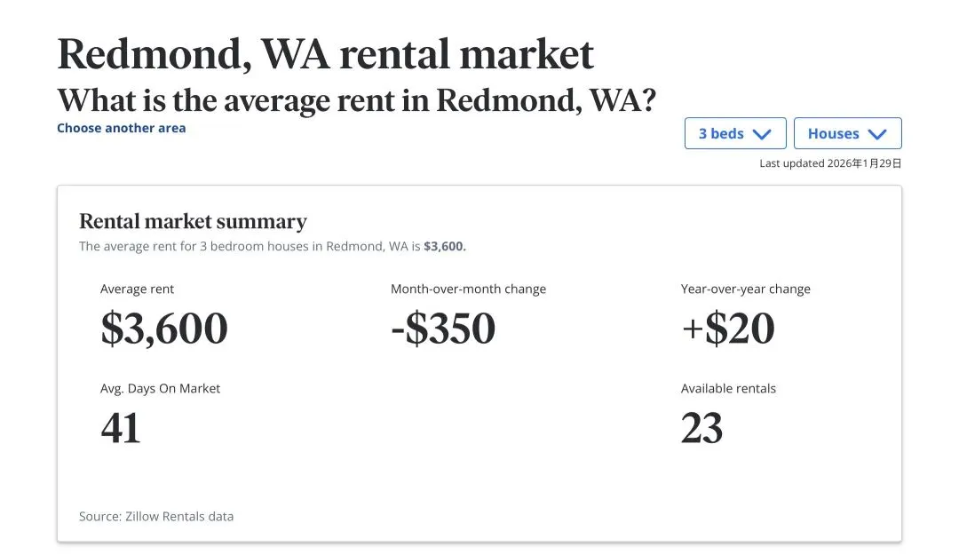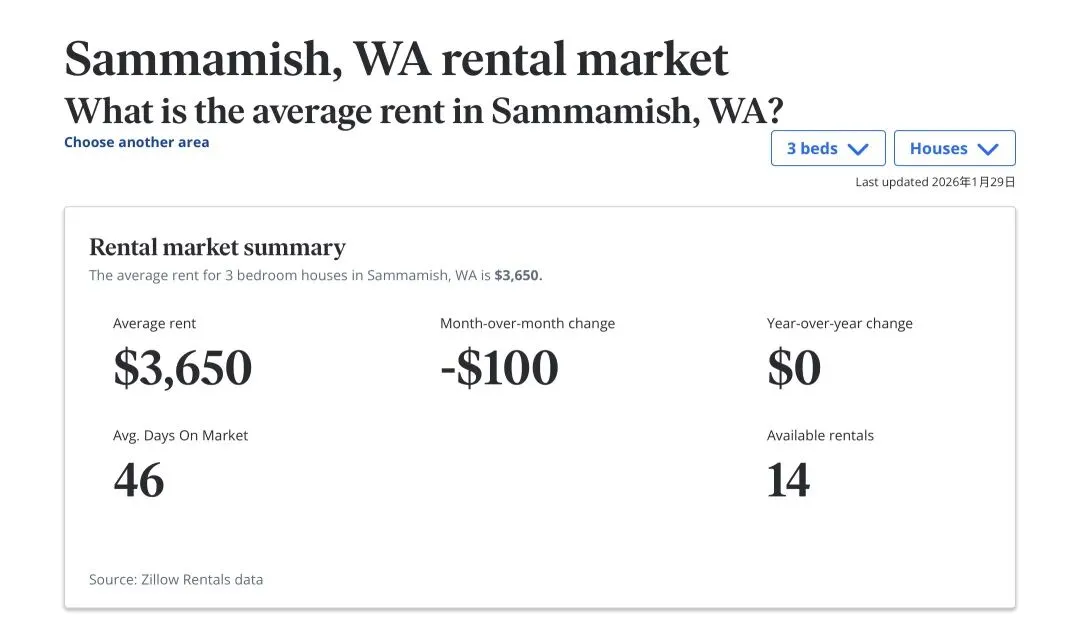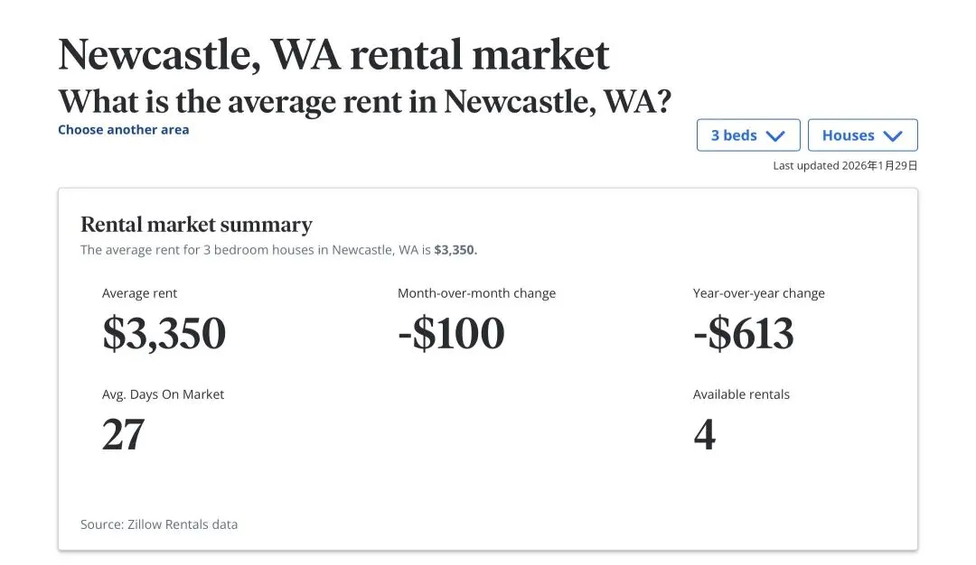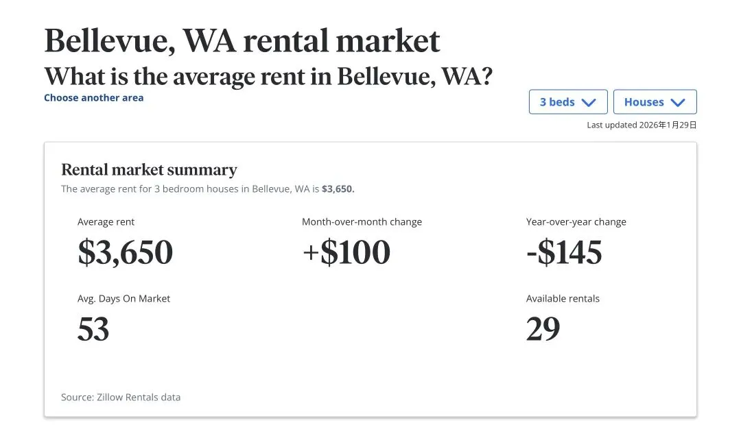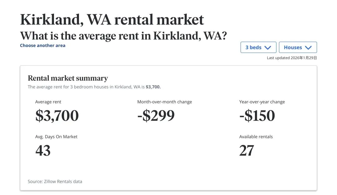 2026年1月西雅图东区(Eastside)租金走势分析:Bellevue与Kirkland稳居高位,Sammamish保持坚挺,而Snoqualmie与Newcastle则出现了显著的同比下调。随着2026年第一个月的结束,西雅图东区的租赁市场呈现出了一幅错综复杂的画面。虽然季节性因素让整体市场略有降温,但各大热门地点的表现各具特色。
