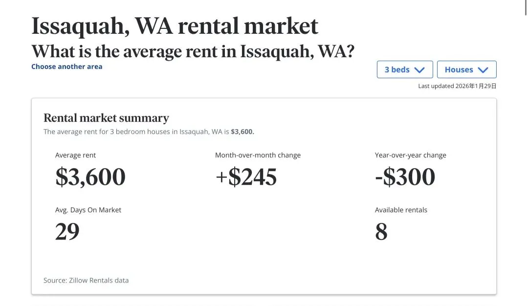 Sammamish表现得异常稳定,租金同比去年完全持平。对于追求优质学区的家庭来说,年初这里依旧是竞争最激烈的区域之一,仅有14套在租房源。Issaquah虽然环比涨幅明显(+$245),但相比去年同期仍下降了 $300,目前仅有8套房源在租,属于典型的“量少价波动”特征。