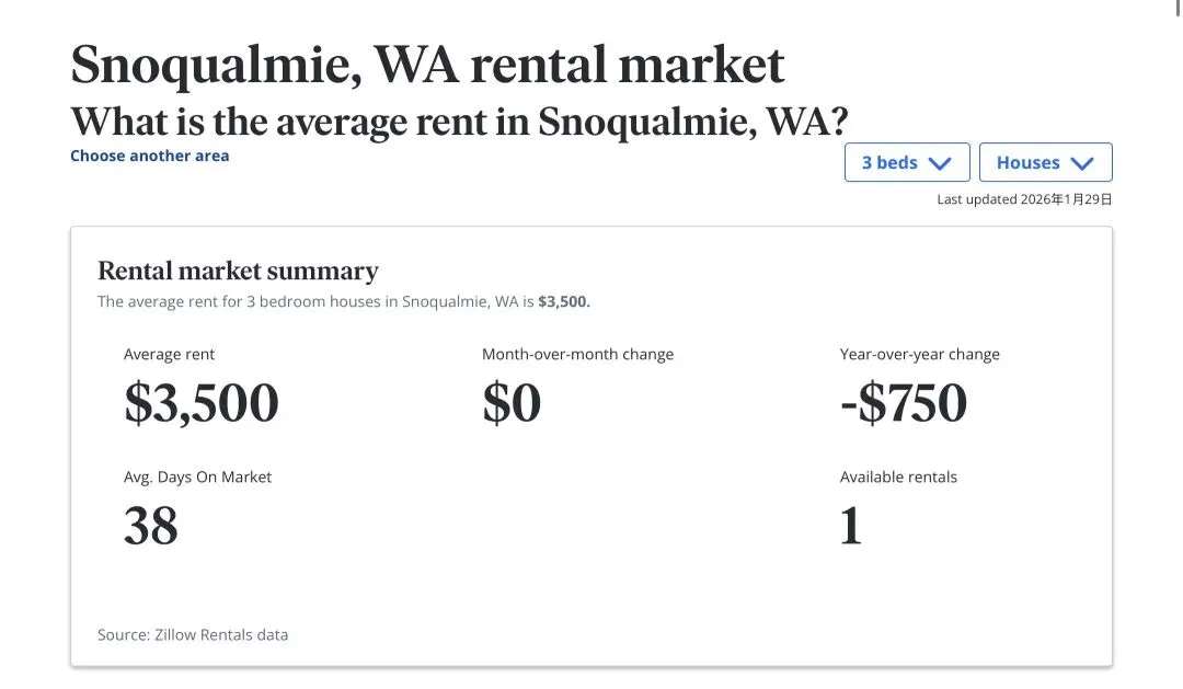 Snoqualmie虽然房源极度紧缺(仅1套),但租金同比下调了 $750。