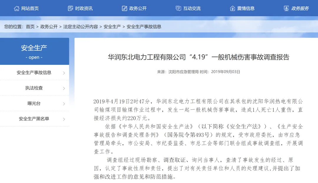 2019年4月19日2时47分,华润东北电力工程有限公司在其承包的沈阳华润热电有限公司输煤项目输煤作业过程中,发生一起一般机械伤害事故,造成1人死亡1人重伤,直接经济损失约220万元。