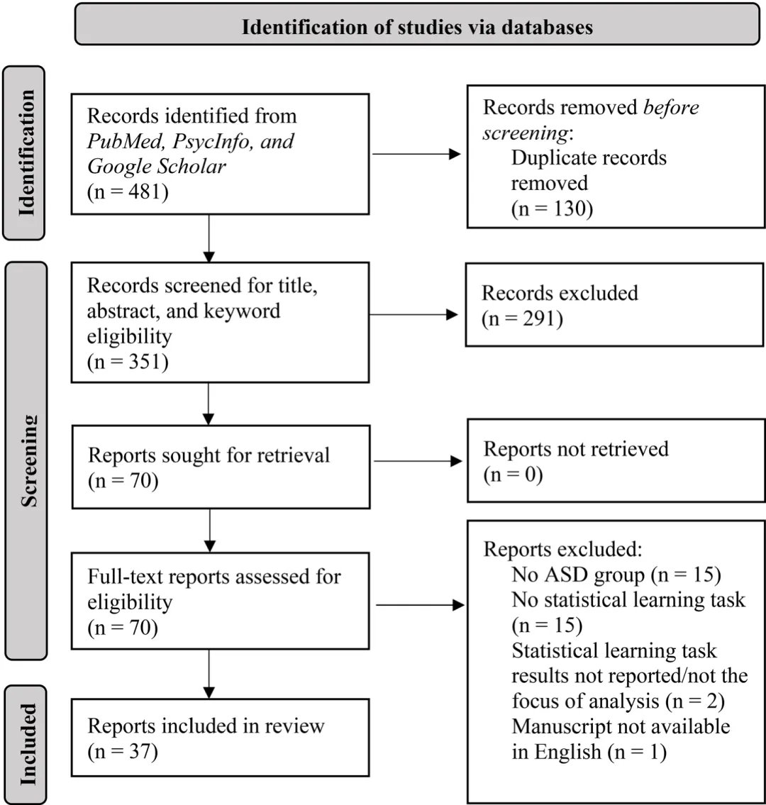 这项预先注册的综述(PROSPERO ID CRD42023431728)对自闭症中的统计学习、内隐学习和程序学习研究进行了系统回顾。考虑自闭症中的统计学习能力在(a)模态(例如,听觉与视觉)、(b)方法(例如,行为与神经影像学)和(c)任务设计方面的差异。此外,作者们还回顾了参与者语言和认知能力的报告情况。假设文献将反映模态和方法内部及之间的混合结果,任务设计之间将引入额外差异,特别是对于任务要求更高的设计。假设神经影像学文献将具有最多样性的结果,因为神经功能个体差异会被放大。最后,假设认知能力的报告将很常见(例如,超过 80%的文章报告了认知能力的测量指标),而语言能力的报告将不常见(例如,不到 20%的文章)。作者们还预测大多数(例如,超过 80%)报告语言和认知能力的文章将描述认知和语言能力处于平均范围的个人,不包括认知和语言能力受损更严重的自闭症个体。