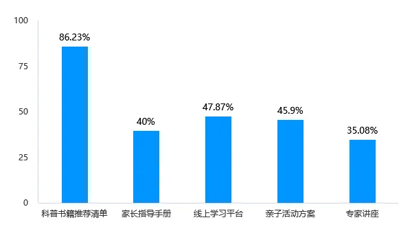 在所有家庭科普阅读支持选项中,选择科普书籍推荐清单的比例达到86.23%,显著高于其他选项,是家长最希望学校提供的支持内容。