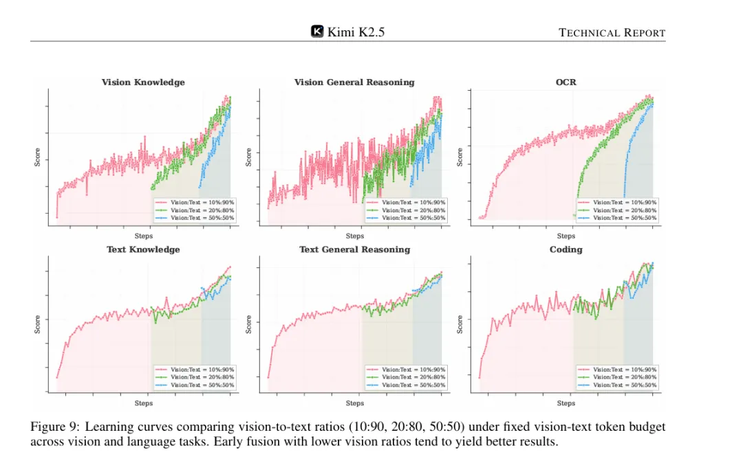 月之暗面团队通过大量实验发现了一个反直觉的结论:在固定的训练资源下,早期融入少量视觉数据(10%-20%),效果比后期大量注入视觉数据(50%)更好。