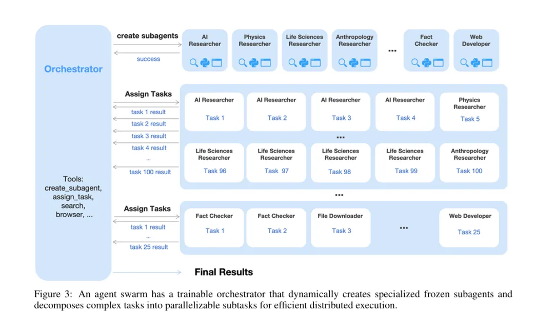 K2.5引入的Agent Swarm完全改变了这一模式: