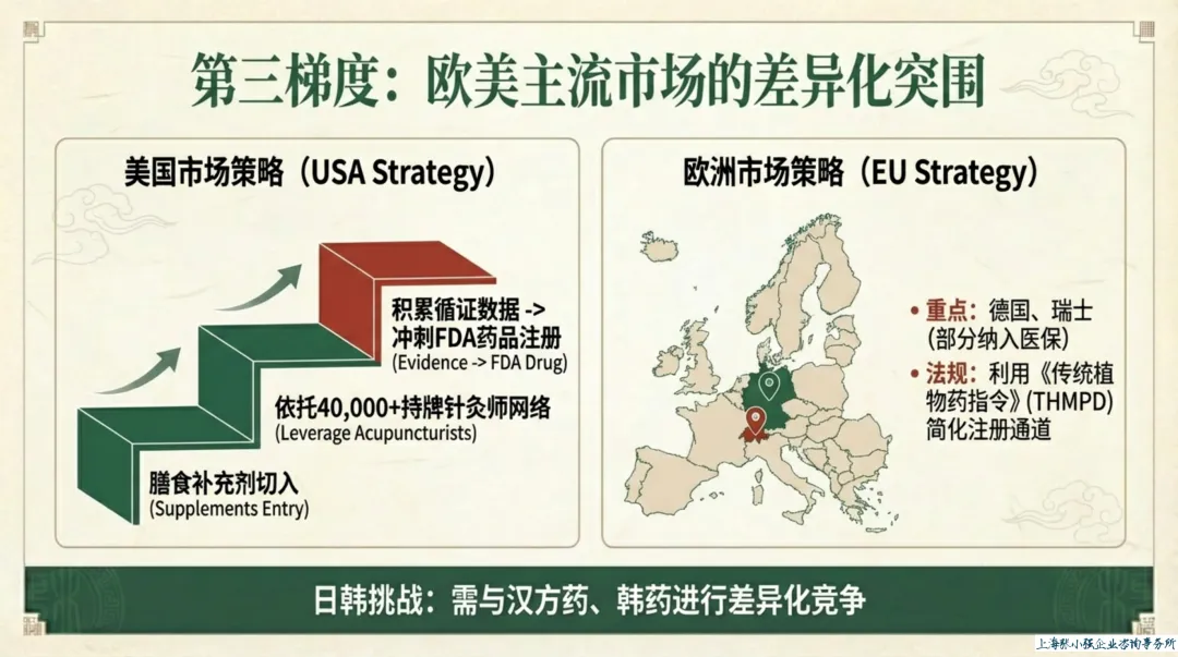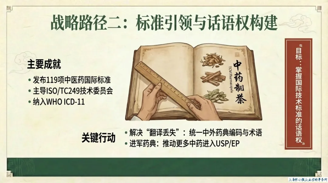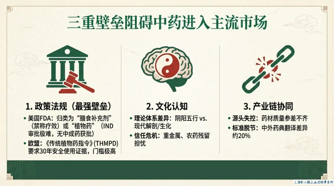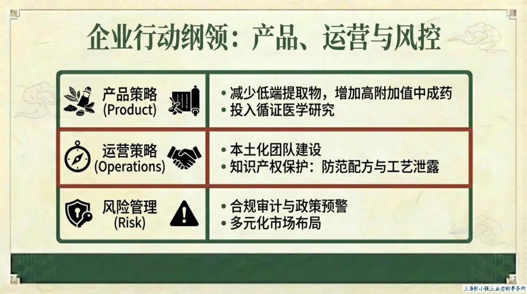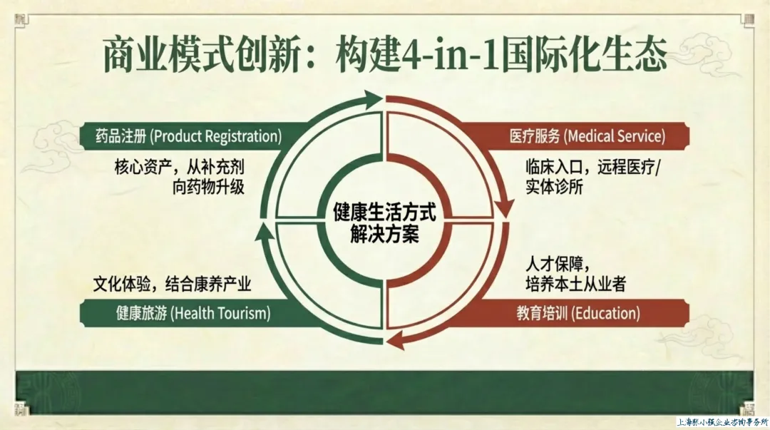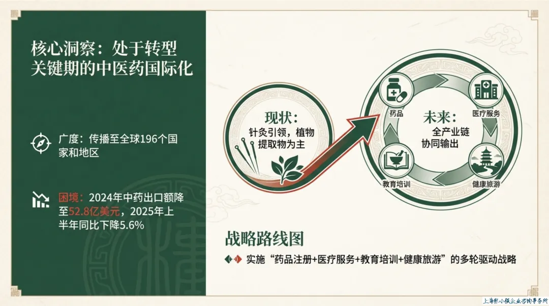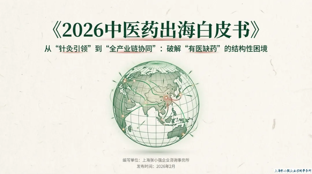 本报告由上海张小强企业咨询事务所 智能体 智探GlobalAI 梳理,面向中医药企业决策者,深入分析了当前“有医缺药”的困境,并提出了包括“借船出海”、国际标准引领、全产业链协同等战略路径,以及产品注册、服务贸易、品牌授权等商业模式,目的是为企业国际化布局提供详实的参考。