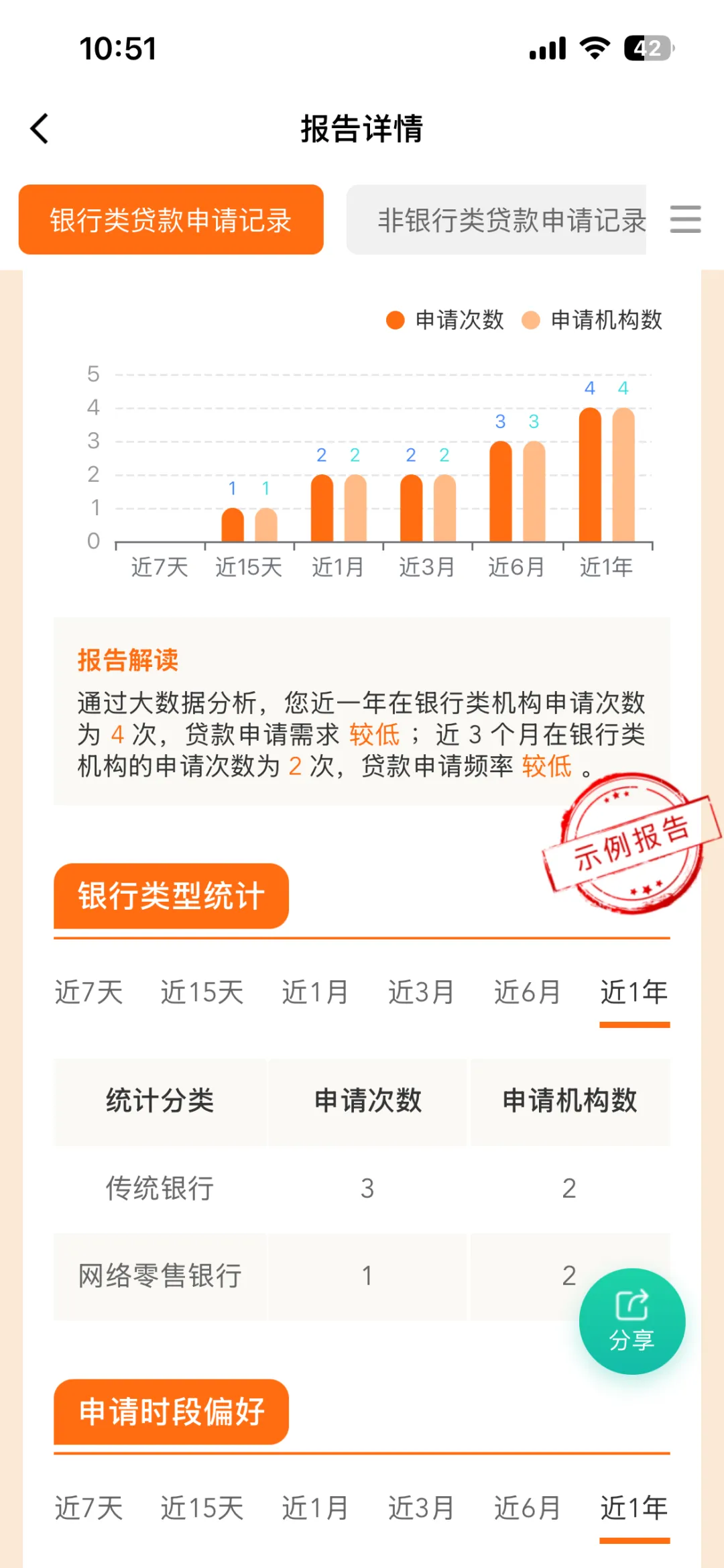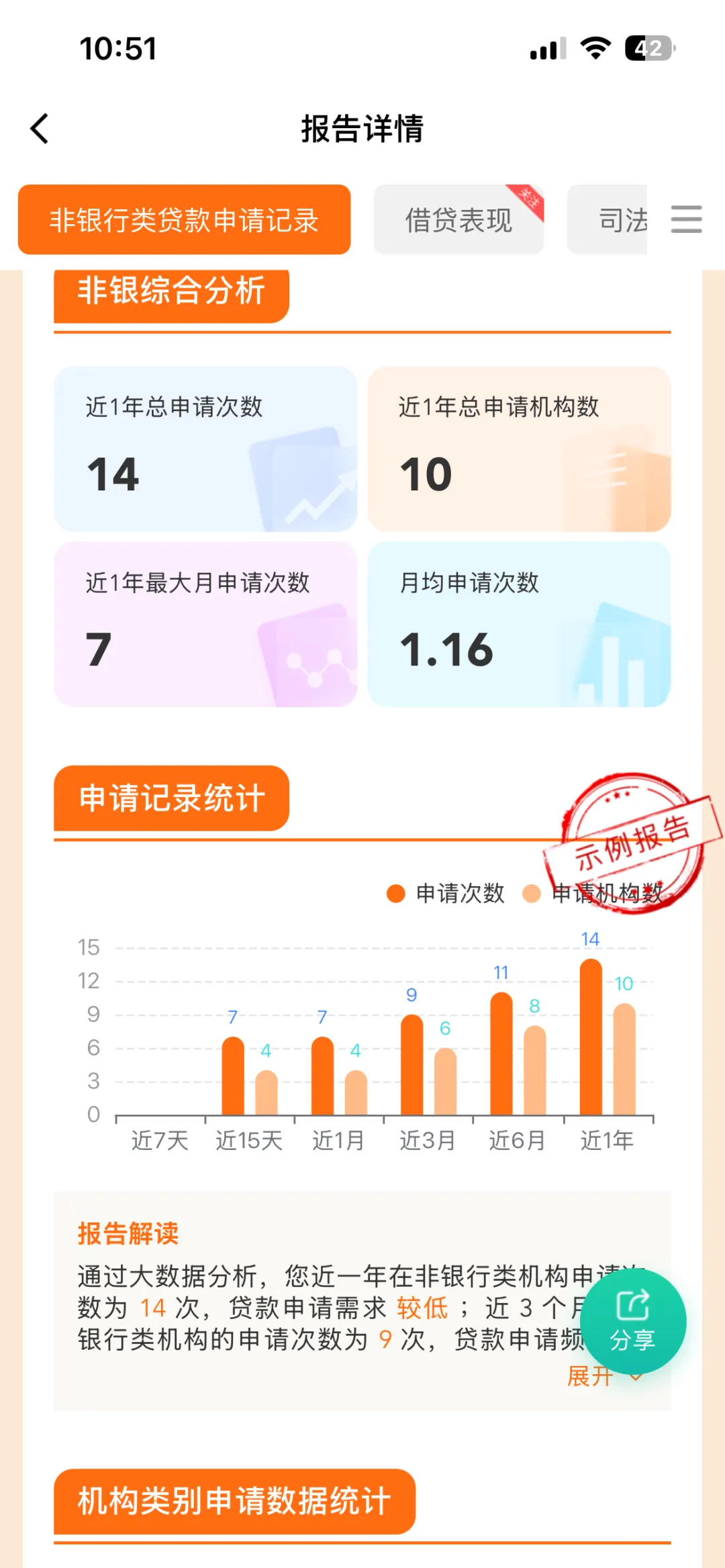 1、综合评分:满分100分,低于60分通常意味着信用状况有待改善,能申请下来贷款的概率越小,这个时候就不要盲目的去申请,白白增加不必要的查询。 2、申请记录:包括各类机构的申请次数,部分未接入央行征信的机构也会在此体现,申请记录肯定是越少越好。