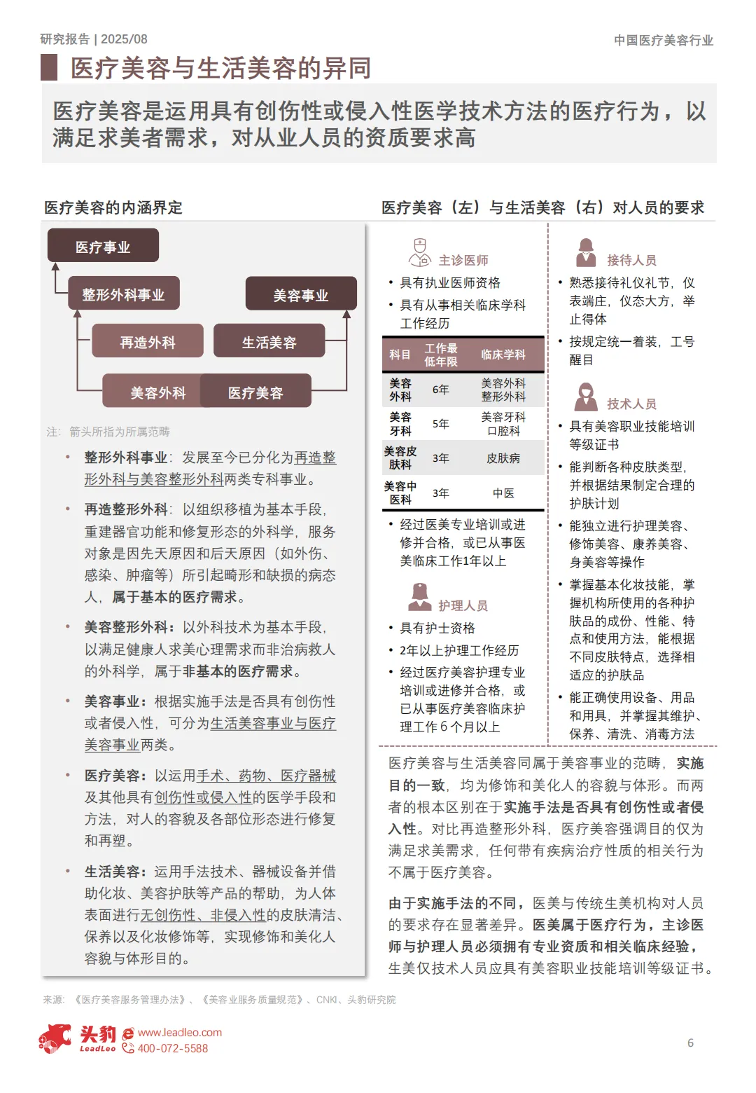 医疗美容与生活美容同属于美容事业的范畴,实施目的一致,根本区别在于实施手法是否具有创伤性或者侵入性。进一步看,医美与生美机构对人员的要求存在显著差异,前者的主诊医师与护理人员必须拥有专业资质和相关临床经验。