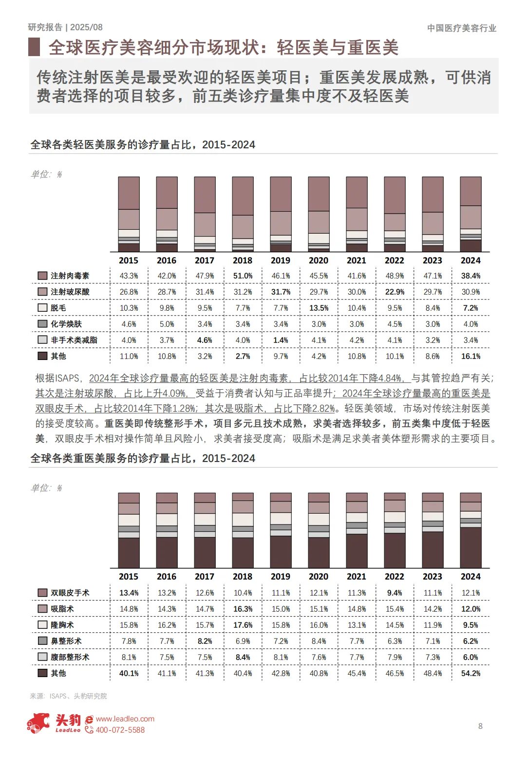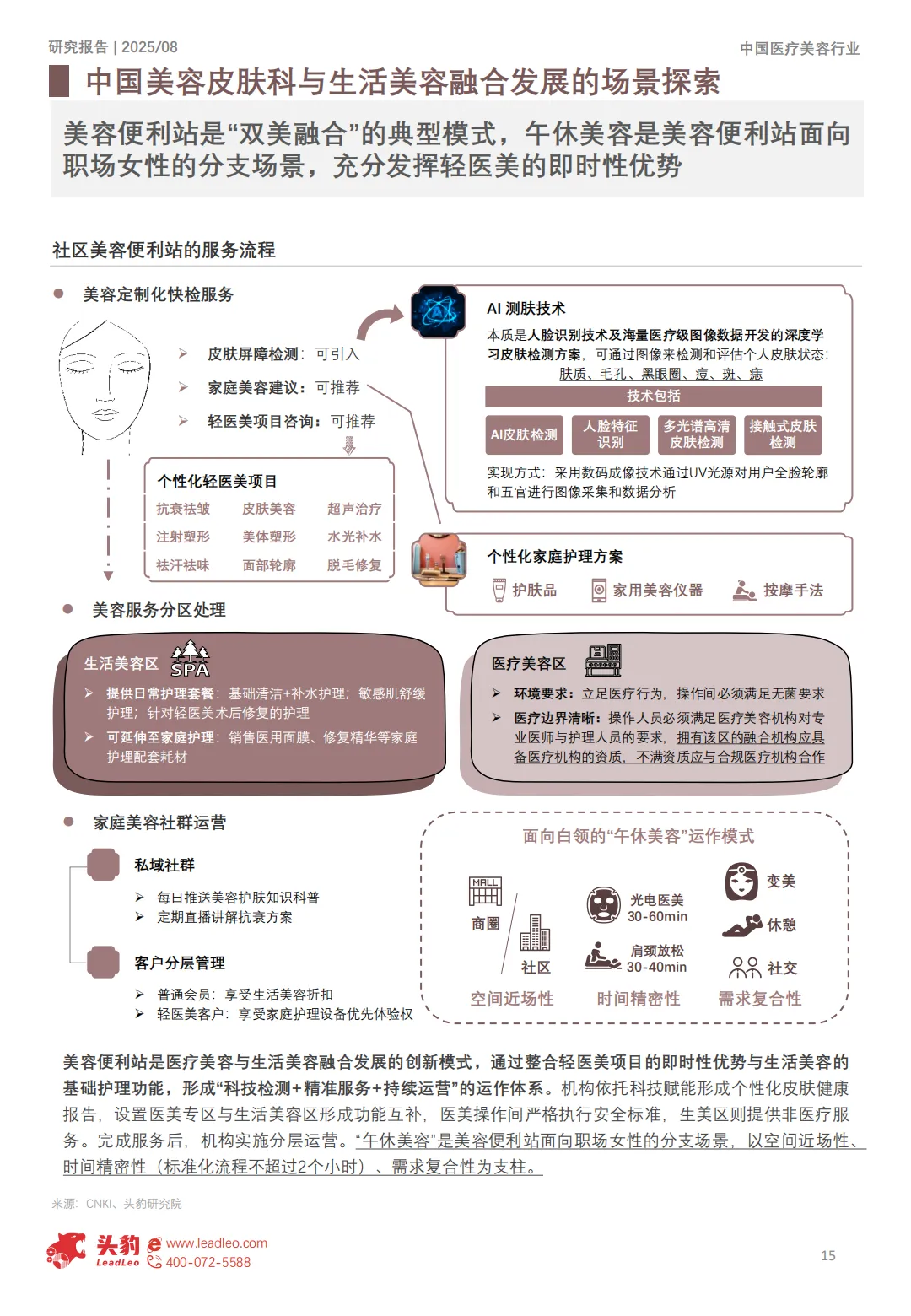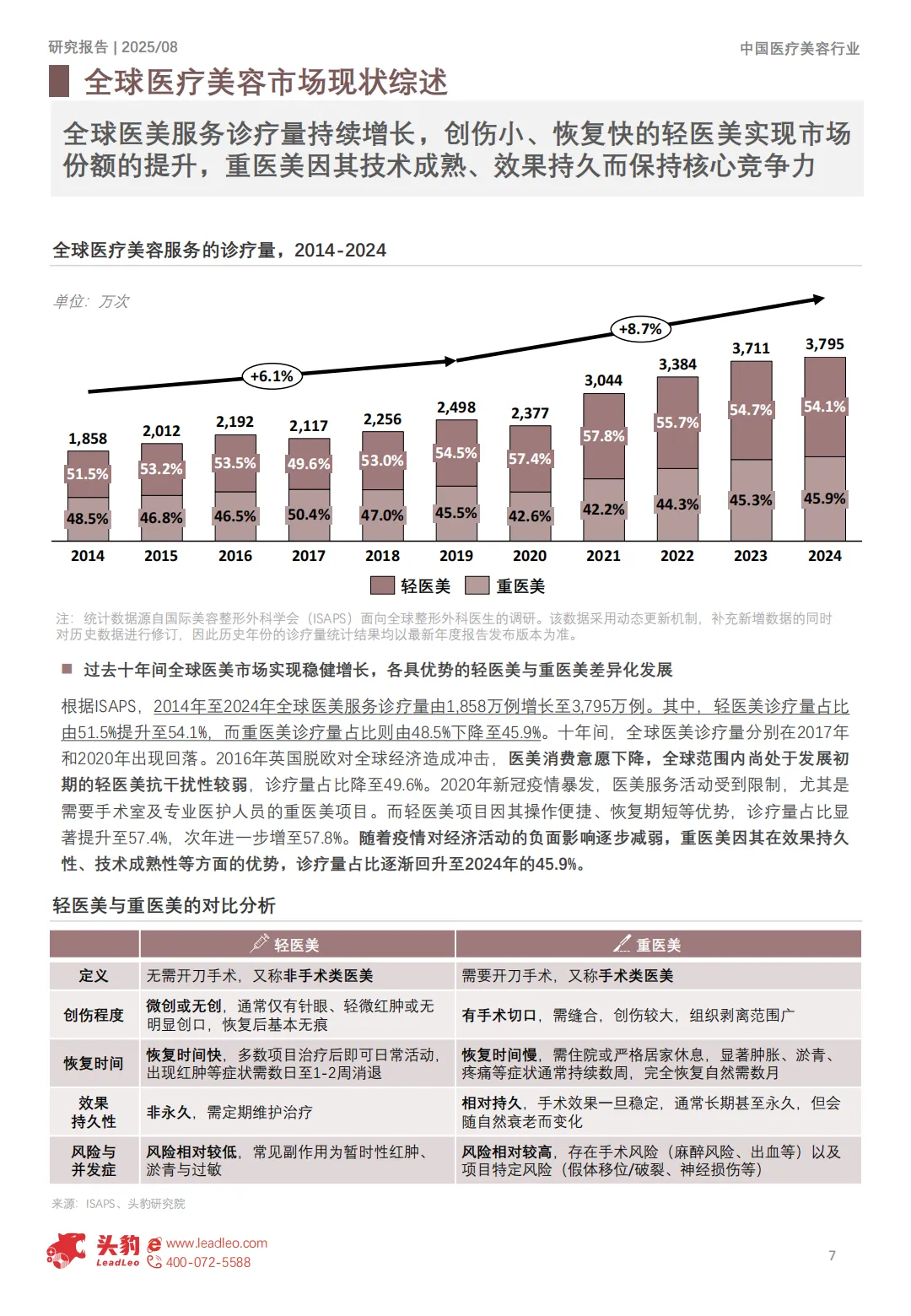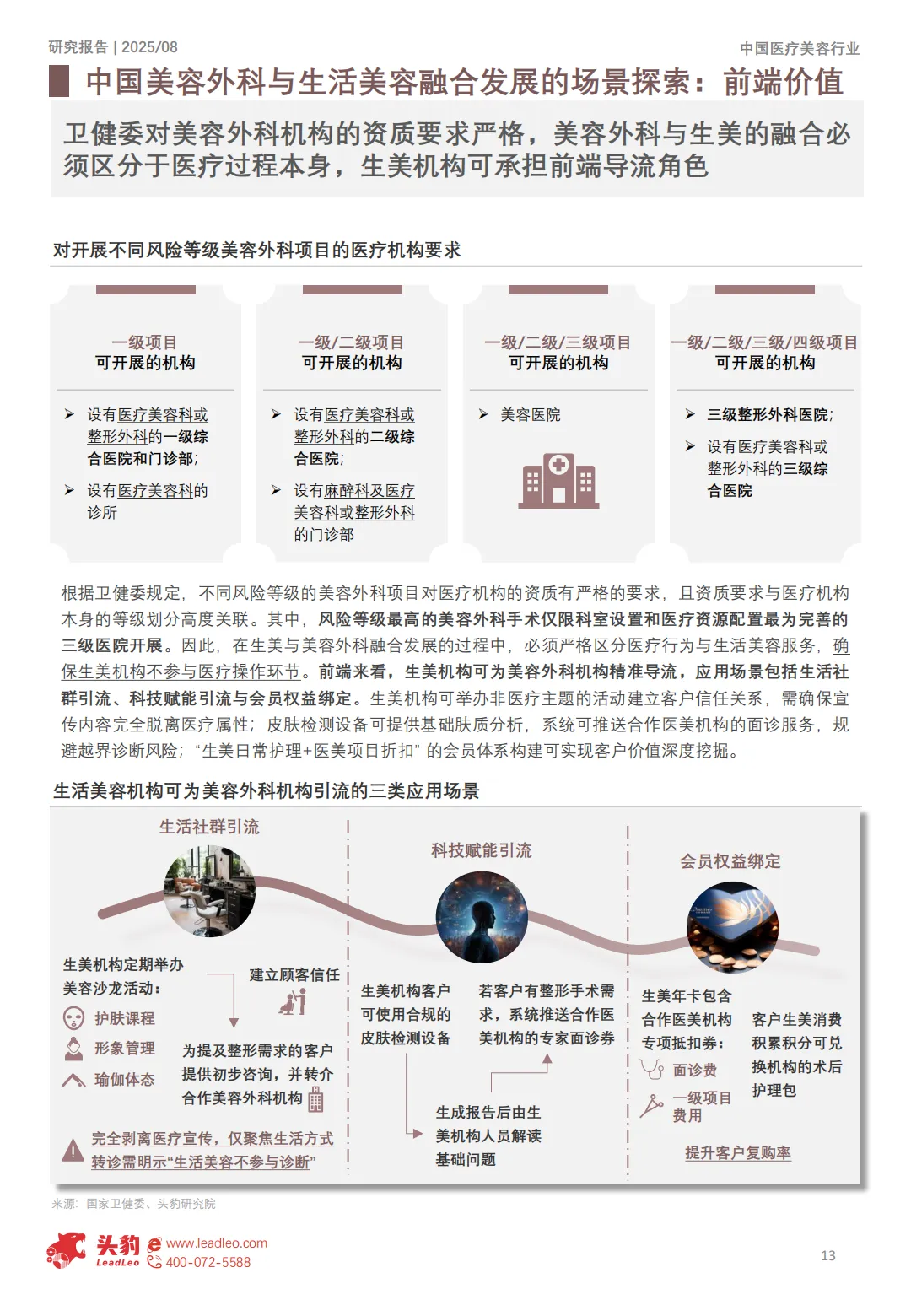 传统医美服务包括重医美与轻医美,轻量化与高频次是全球及中国医美消费的发展趋势。美容外科以重医美为主,机构实行分级风险管理,与生美融合需完全脱离医疗过程;美容皮肤科以轻医美为主,尤以光电类医美为优,与生美融合场景以美容便利店为代表。