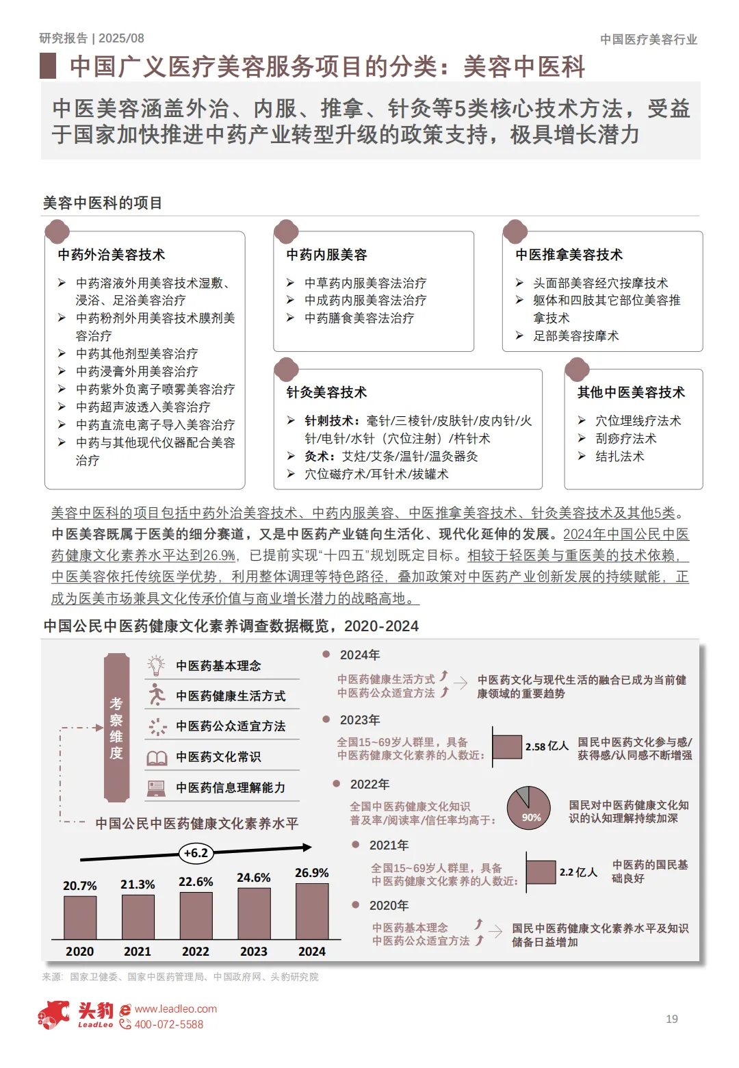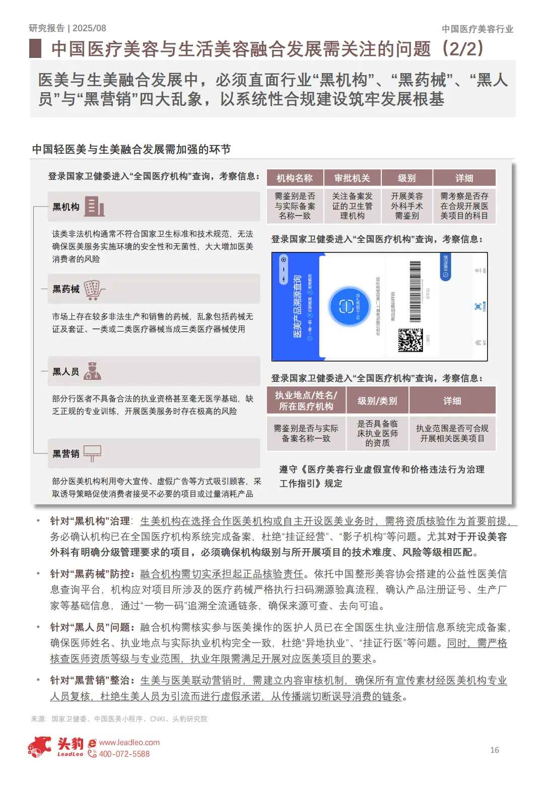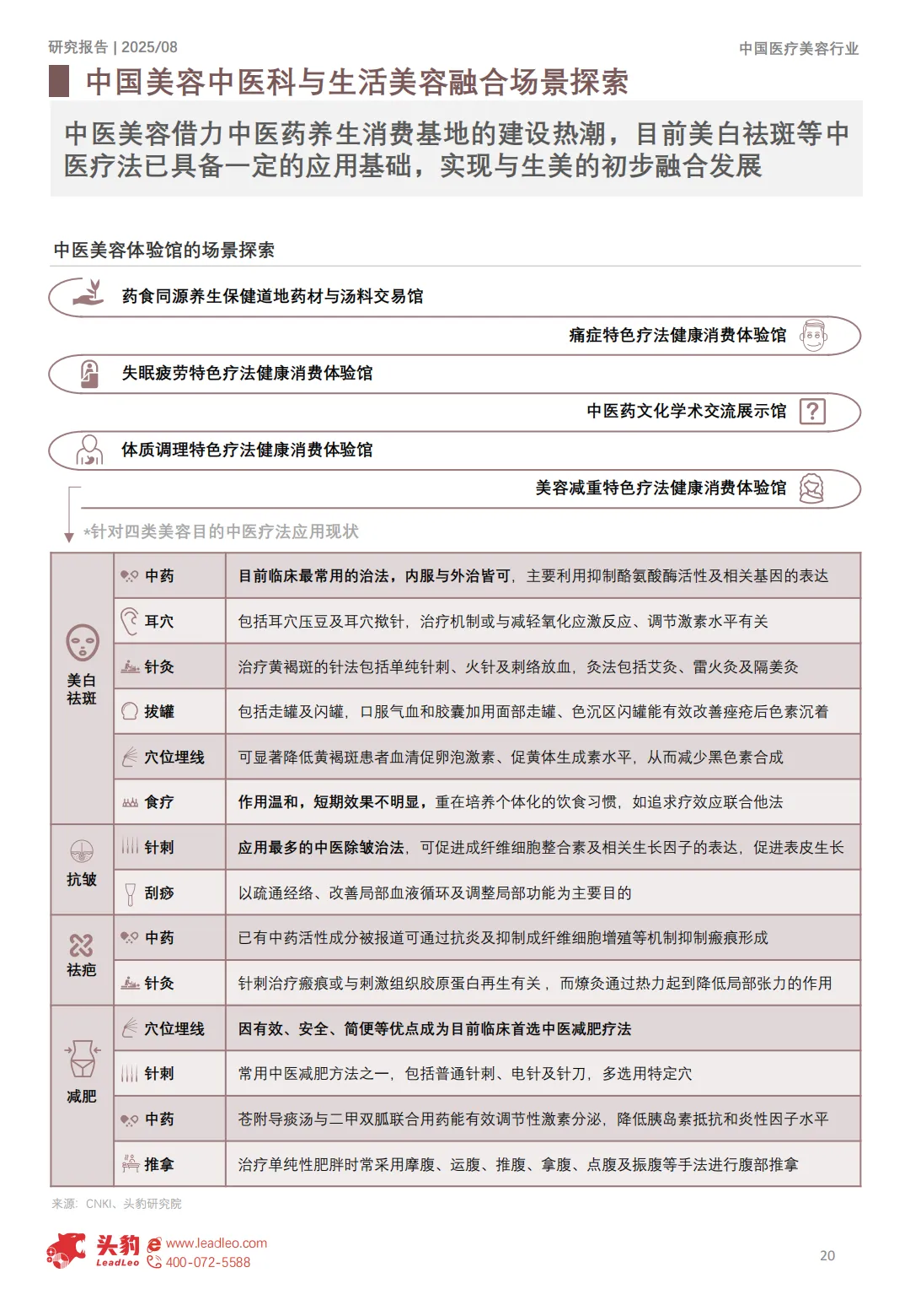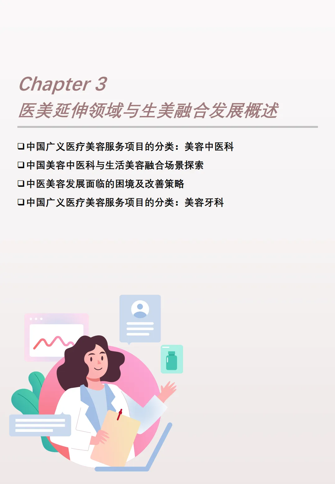 根据《医疗美容项目分级管理目录》,中国广义医疗美容的范畴还包括美容中医科与美容牙科。美容中医依托政策利好和“药食同源”产品开发潜力,可通过中医体验馆等场景探索与生美的融合发展,但需注意其疗效验证不足、监管标准模糊等问题。