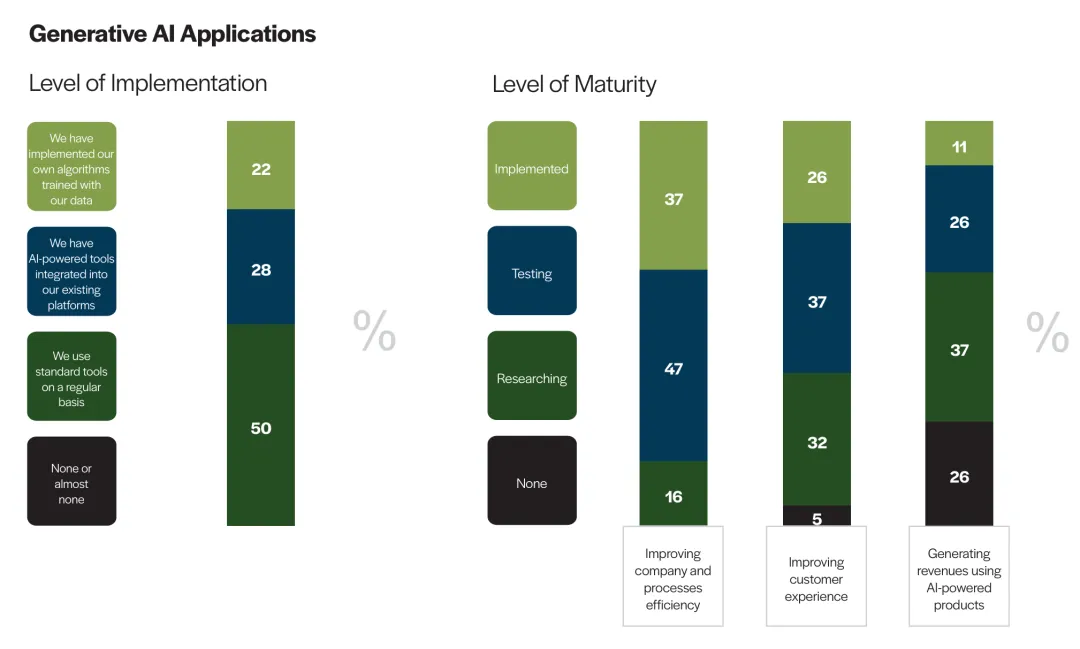 AI 驱动的产品创造收入:11%正在实施创收业务(很领先),26%在测试,28%正在测试,37%正在研究