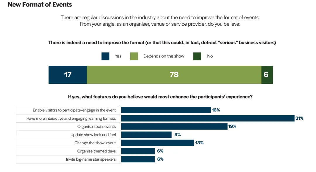 改革共识:17%的企业认为需要改进展览形式,78%认为取决于展会类型,6%认为不需要改变。