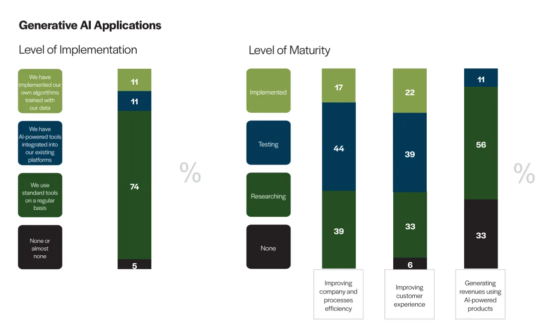 应用水平:96%已使用AI(74%使用标准工具,11%将AI工具集成到现有平台,11%开发自己的算法),仅5%未使用或几乎不使用。