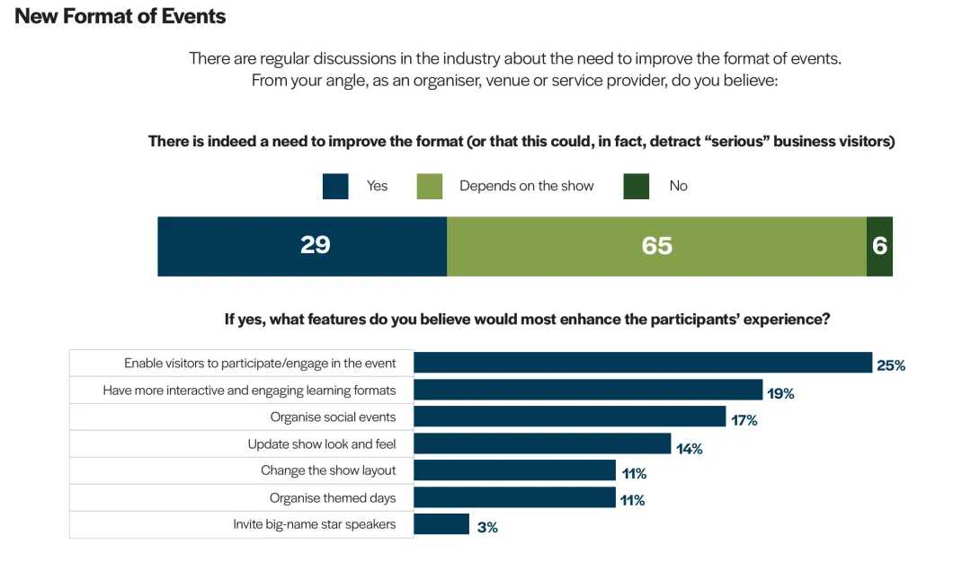 改革共识:29%的企业认为需要改进展览形式(低于全球37%),65%认为取决于展会类型(高于全球58%),6%认为不需要改变。