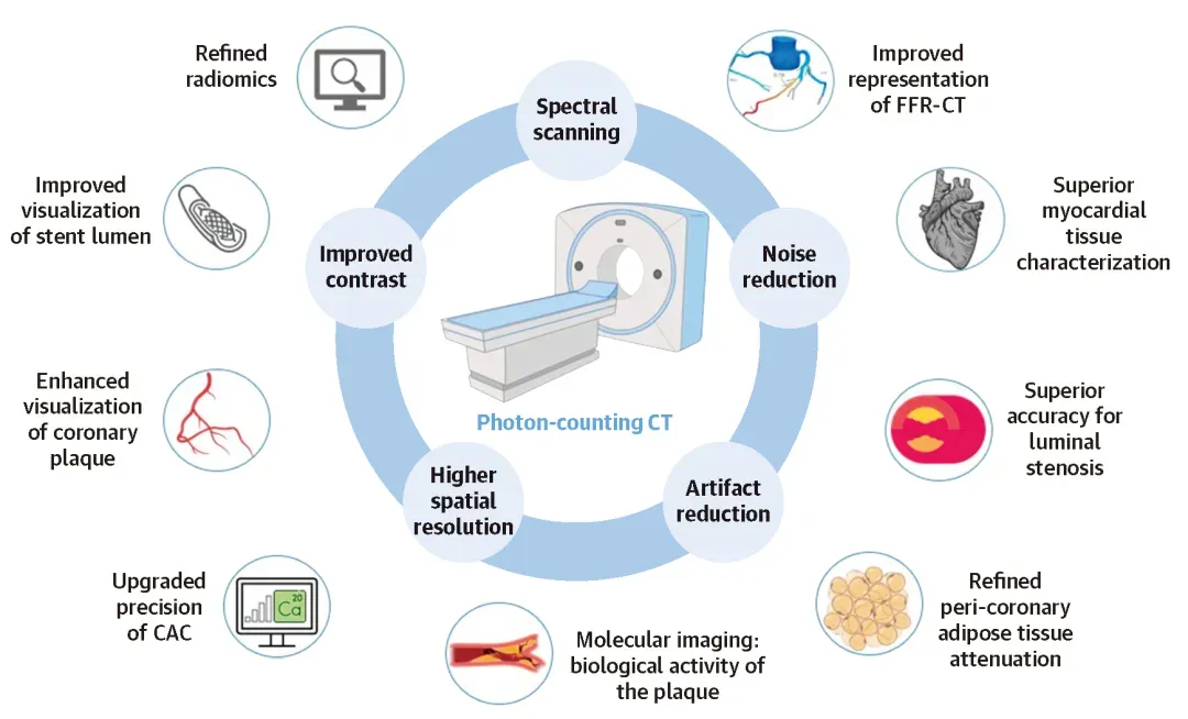 光子计数CT在心血管成像领域展现出革命性临床价值:通过创新的光子计数半导体材质,实现了更高空间分辨率、增强对比度、光谱扫描、噪声与伪影减少等核心技术突破,并以此为基础,在临床中实现了冠状动脉斑块的精准可视化与活性评估、支架植入术后的精细化随访、FFR-CT 功能学评估的优化,同时还支持更优的心肌组织表征、放射组学分析等高级应用,为心血管疾病的早期诊断、风险分层和精准治疗提供了全方位的影像解决方案。
