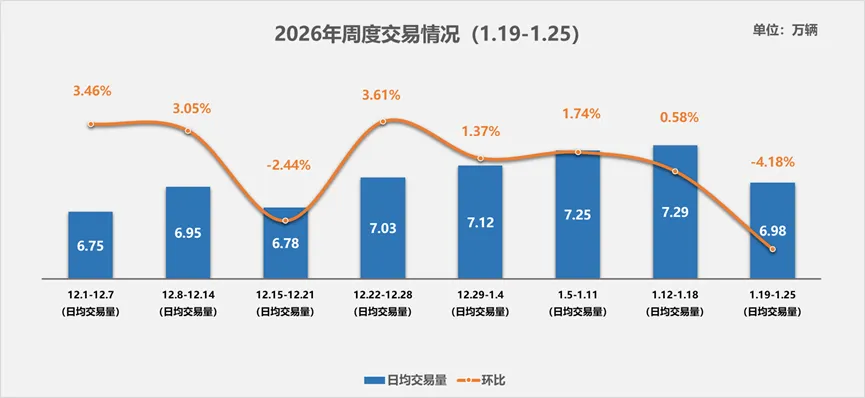 2026年1月19日至25日,国内二手车日均交易量6.98万辆,环比上周下降4.18%,结束了连续三周的环比增长态势。从周度走势来看,市场在经历 12 月中上旬的阶段性调整后,于去年末至年初进入上行通道,本周的回调属市场正常波动,整体交易量仍维持在相对稳健的区间。考虑到春节假期临近,二手车经销商后续需密切关注供需端波动对交易节奏的持续变化。