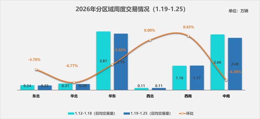 本周,二手车市场整体呈现温和回落态势。从区域市场表现来看,东北、华北、华东及中南地区日均交易量均出现不同程度下滑;西南地区交易量实现小幅增长,而西北地区交易走势保持平稳。